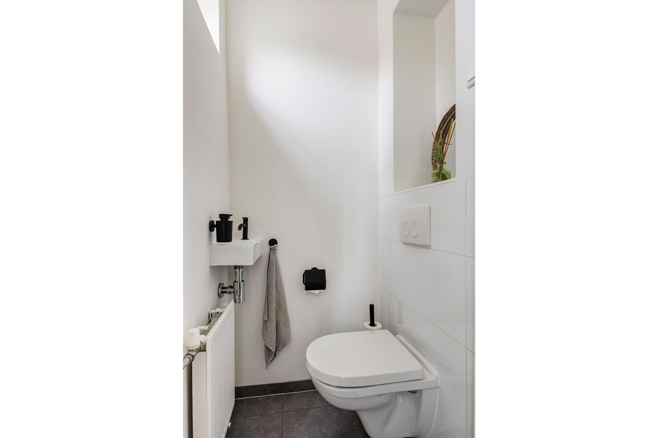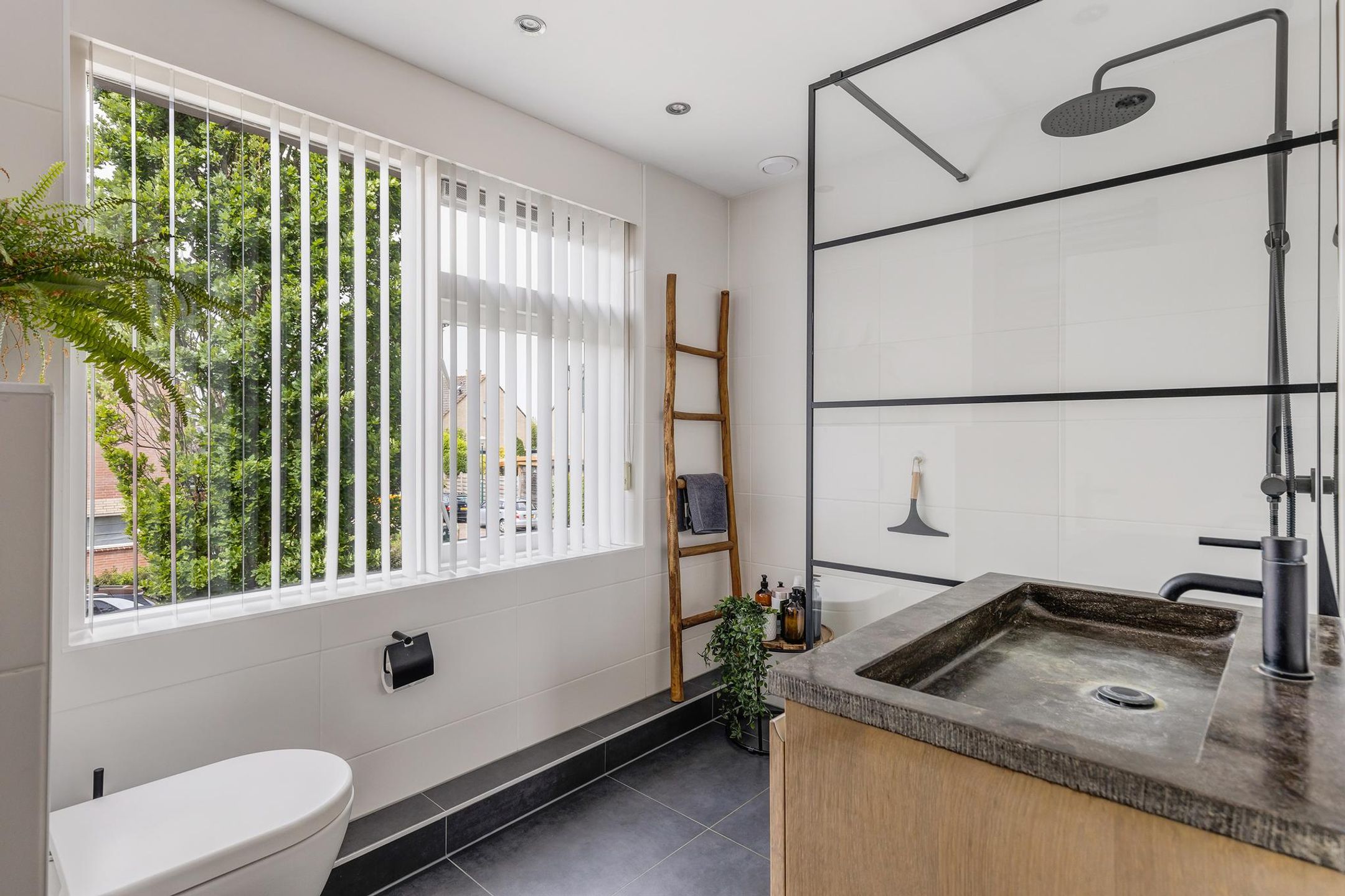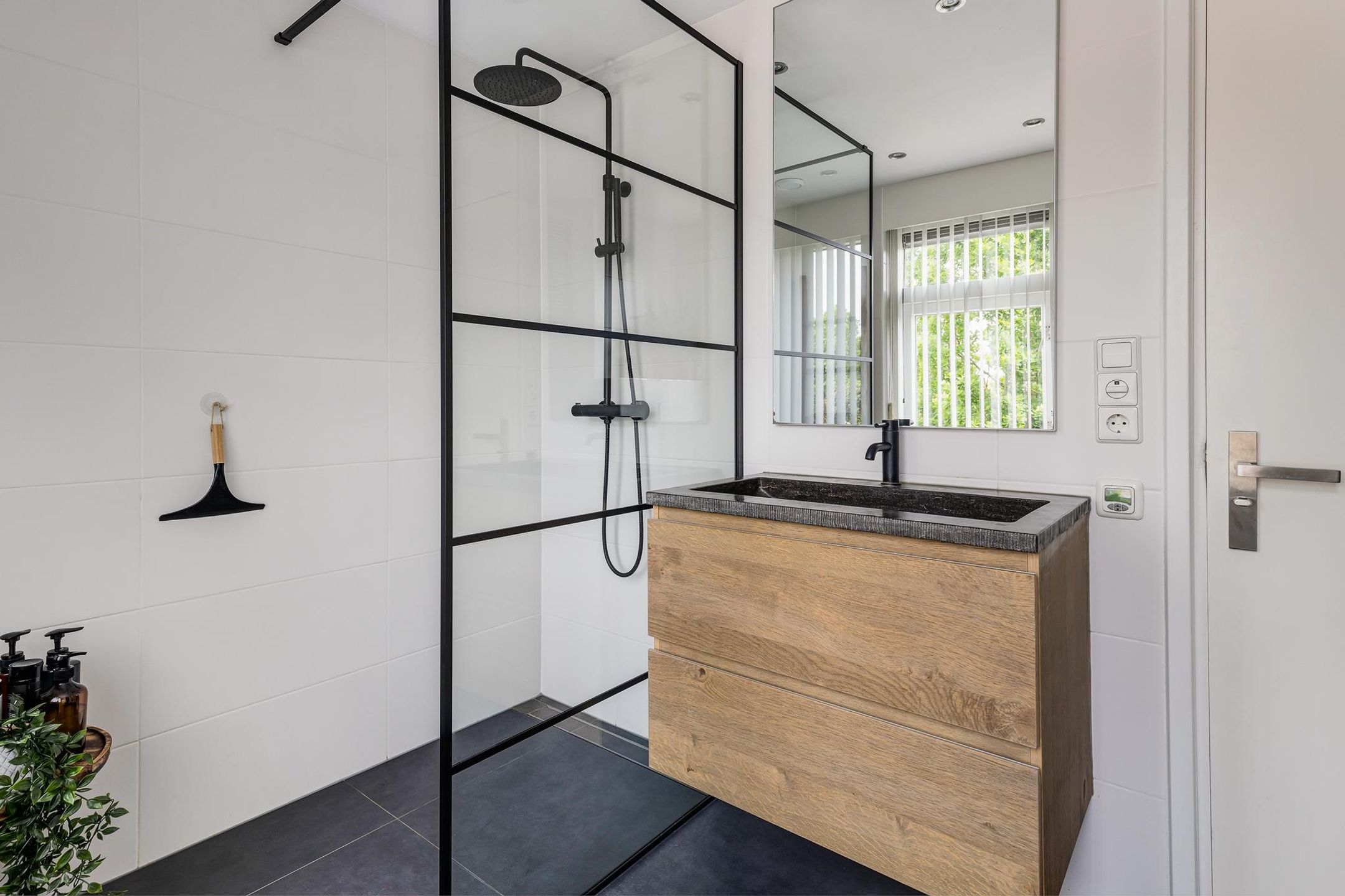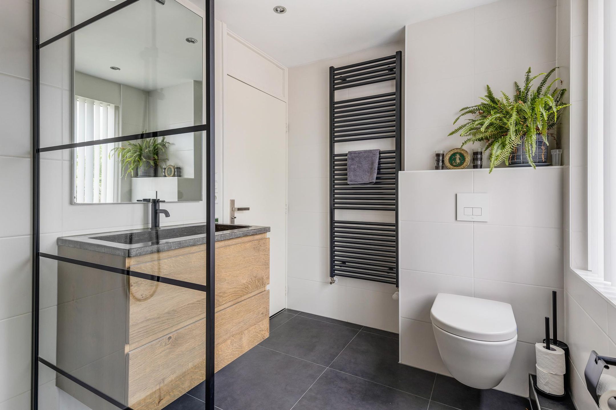 De moderne badkamer is voorzien van een ruime inloopdouche, tweede toilet, wastafelmeubel, design radiator en vloerverwarming.