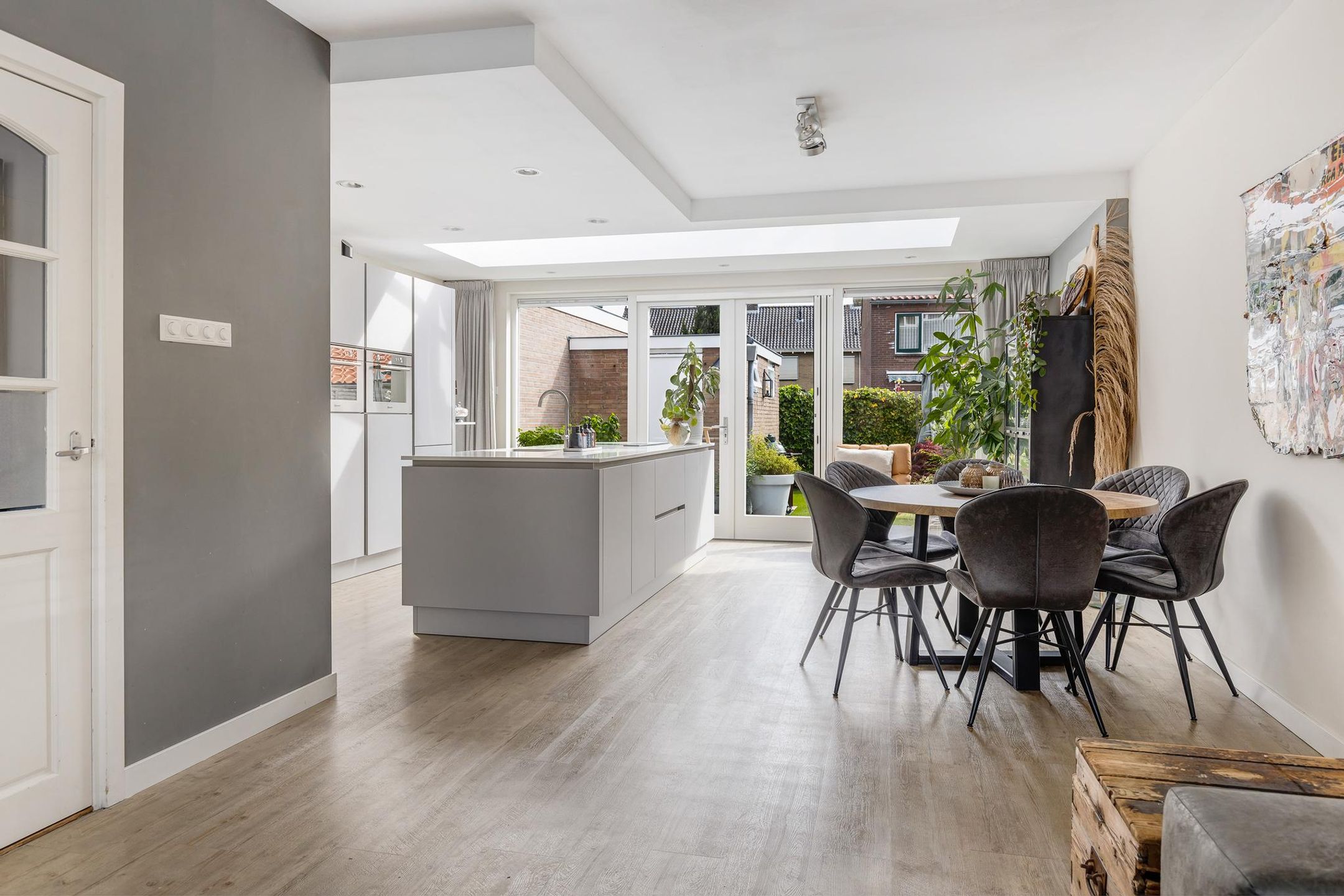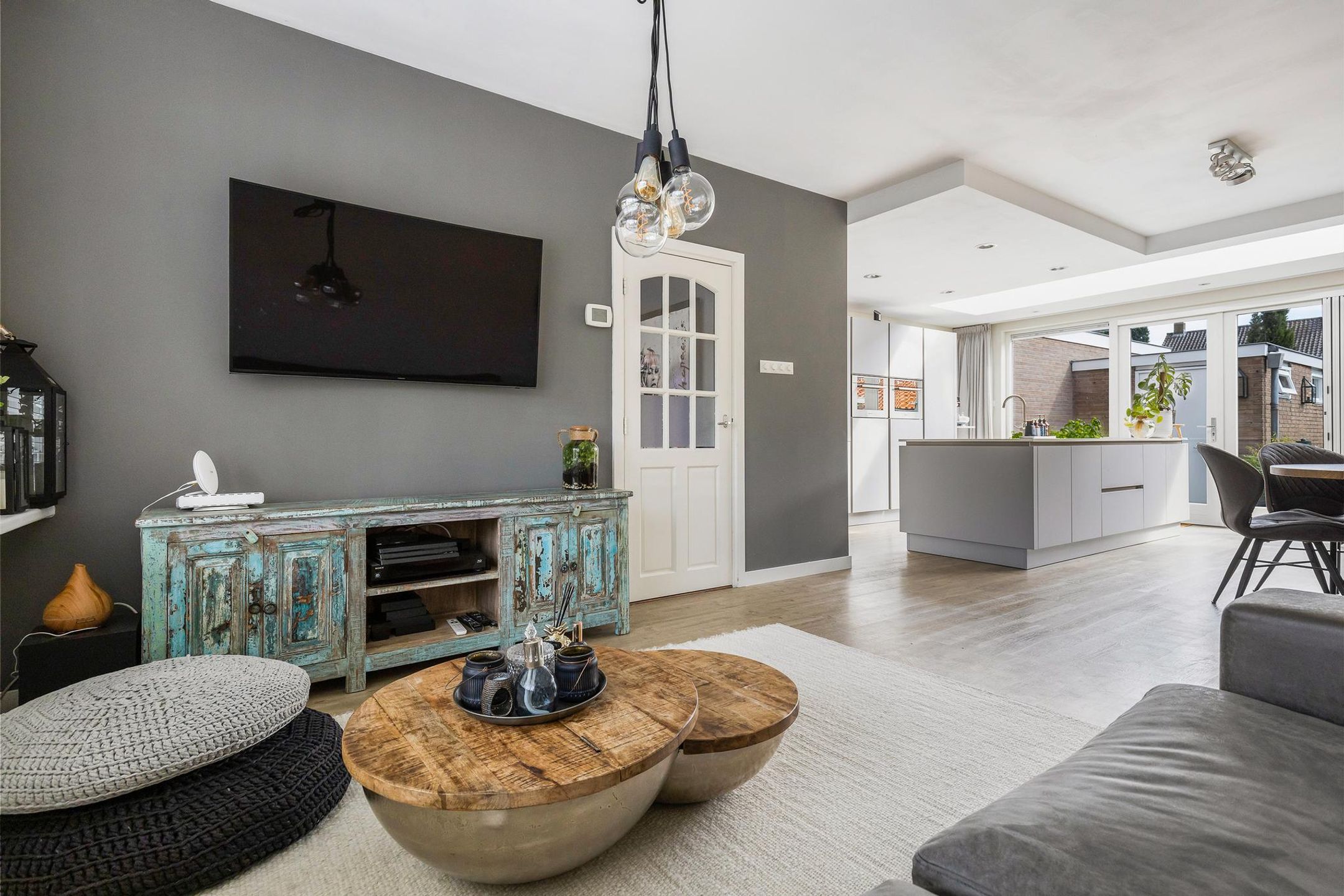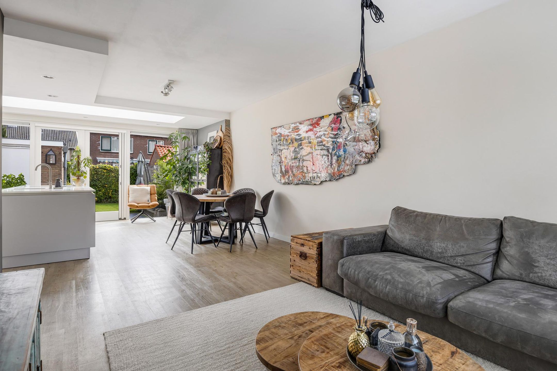 Aangrenzend aan de keuken is een fijne eethoek en de sfeervolle woonkamer gerealiseerd.