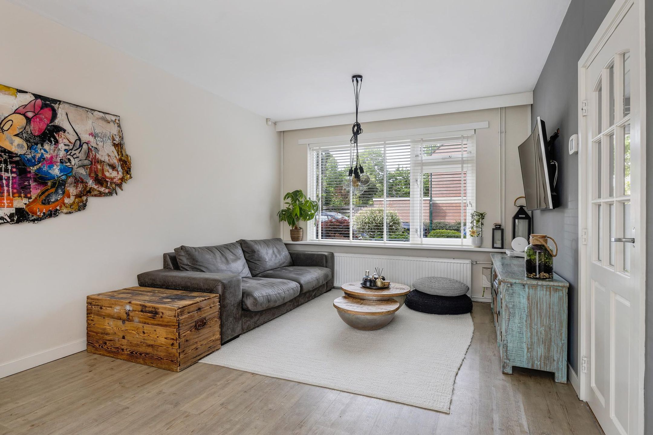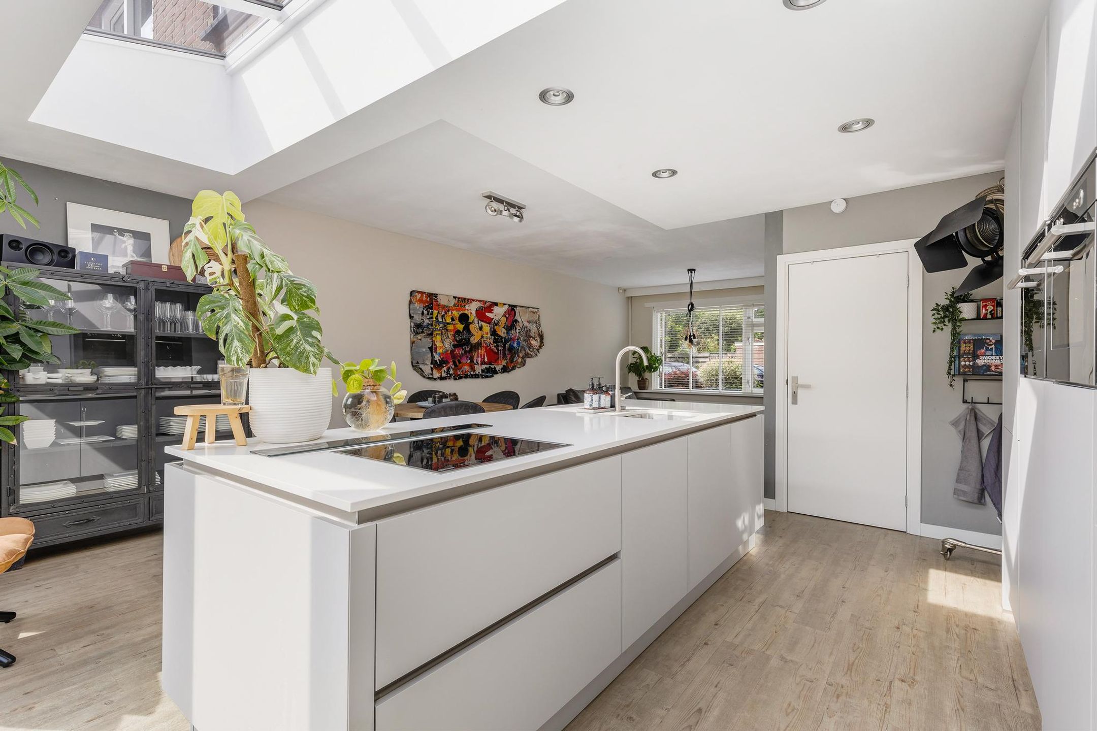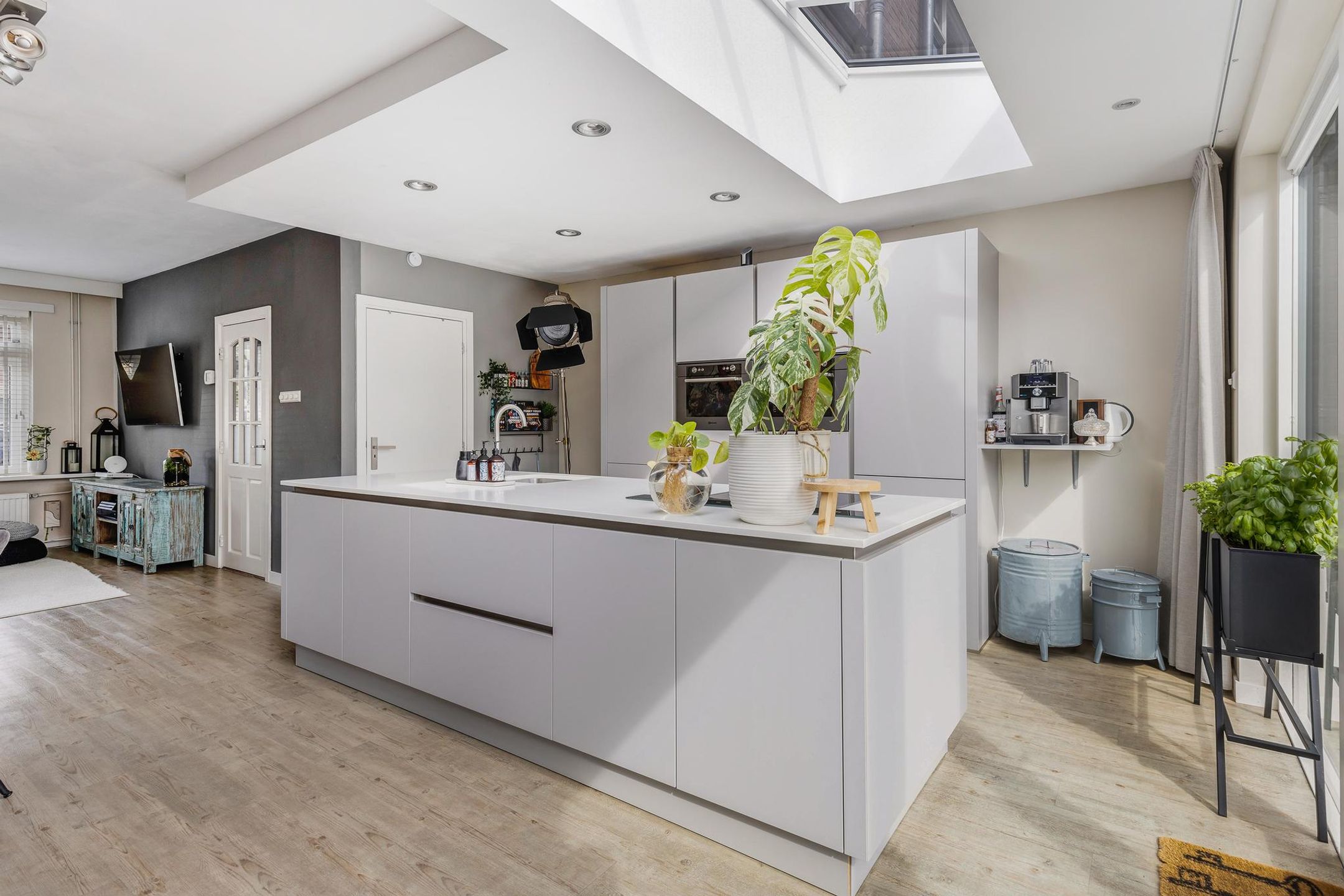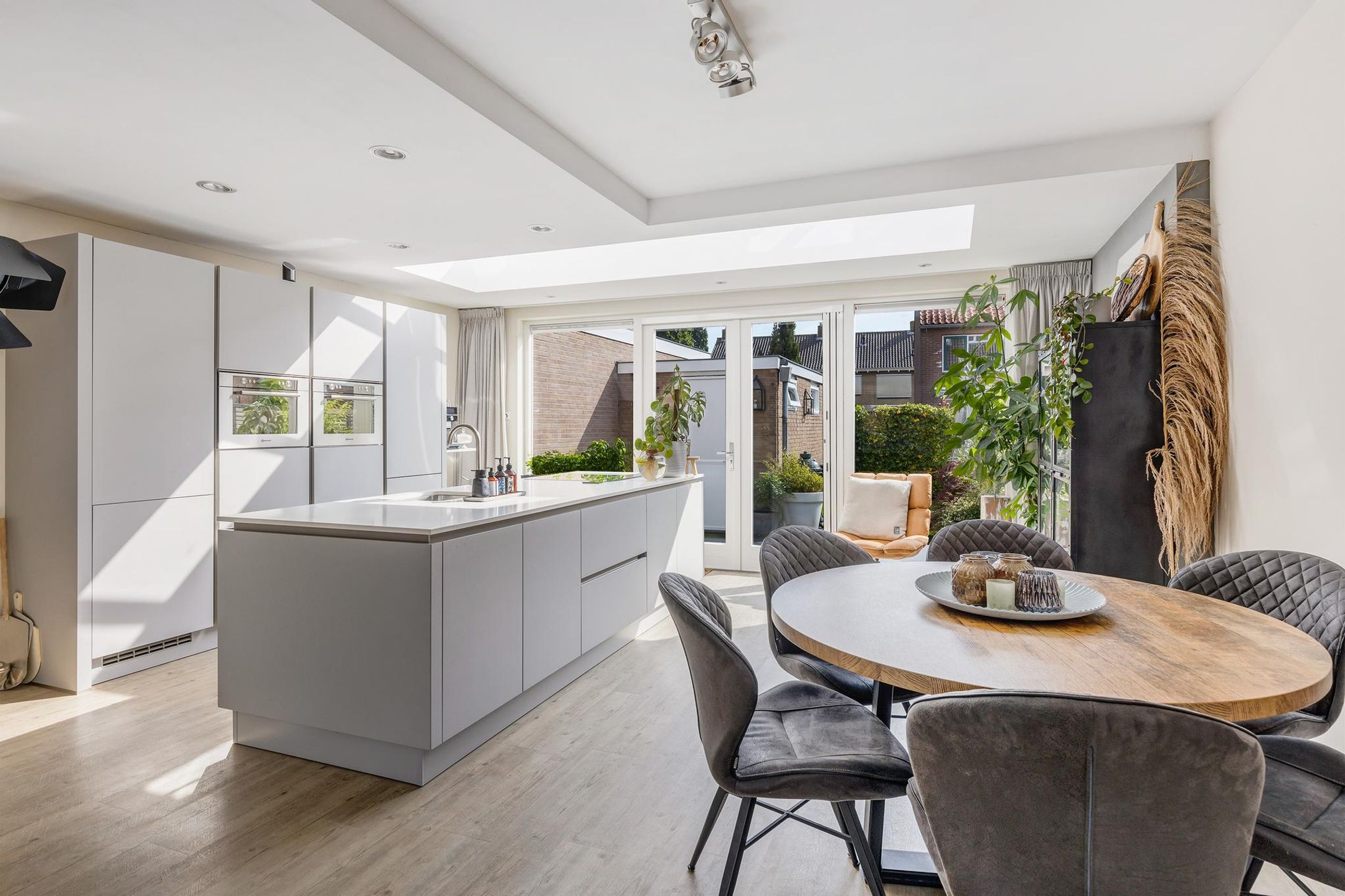 Aangrenzend aan de keuken is een fijne eethoek en de sfeervolle woonkamer gerealiseerd.