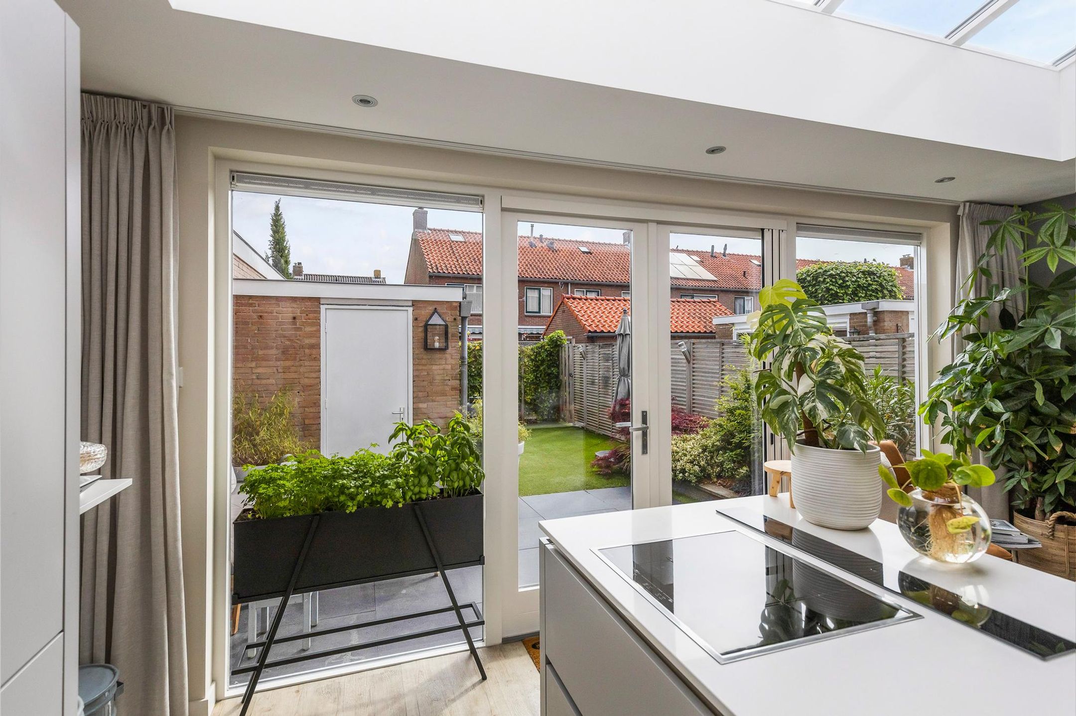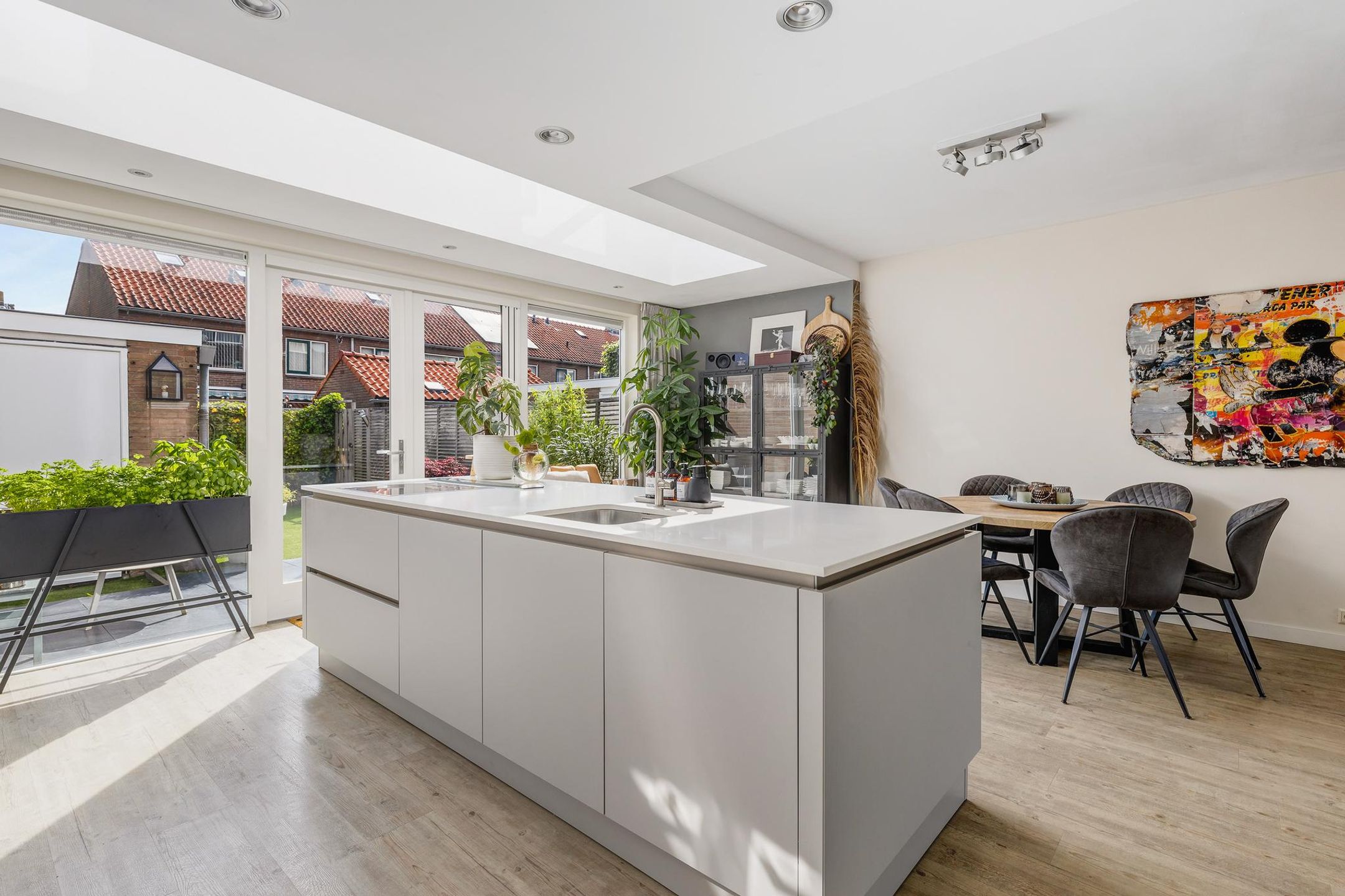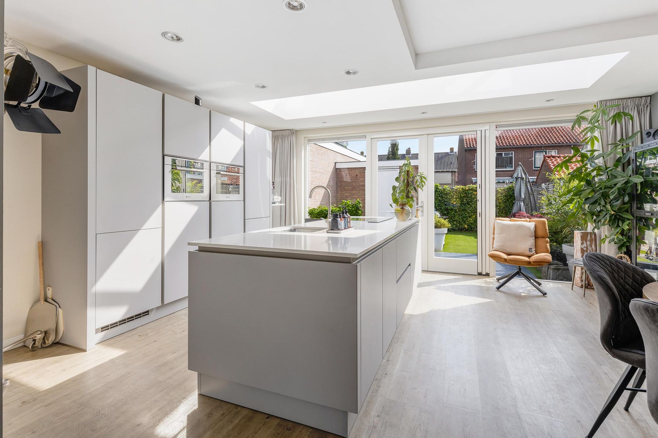 De lichte uitgebouwde woon-eetkeuken (2015) is een echte “eye-catcher” van deze woning. Deze heerlijke woon-eetkeuken is in de uitbouw van de woning gerealiseerd. De uitbouw is voorzien van een lichtstraat in het dak en grote raampartijen met openslaande deuren naar de tuin waardoor er veel licht de ruimte binnenkomt.