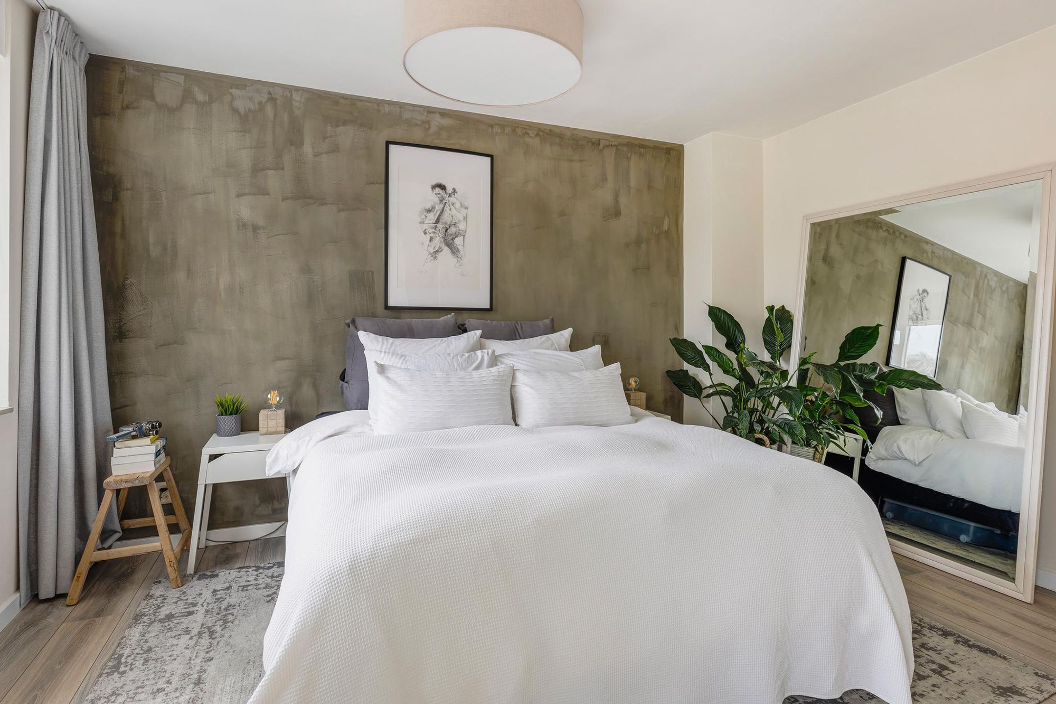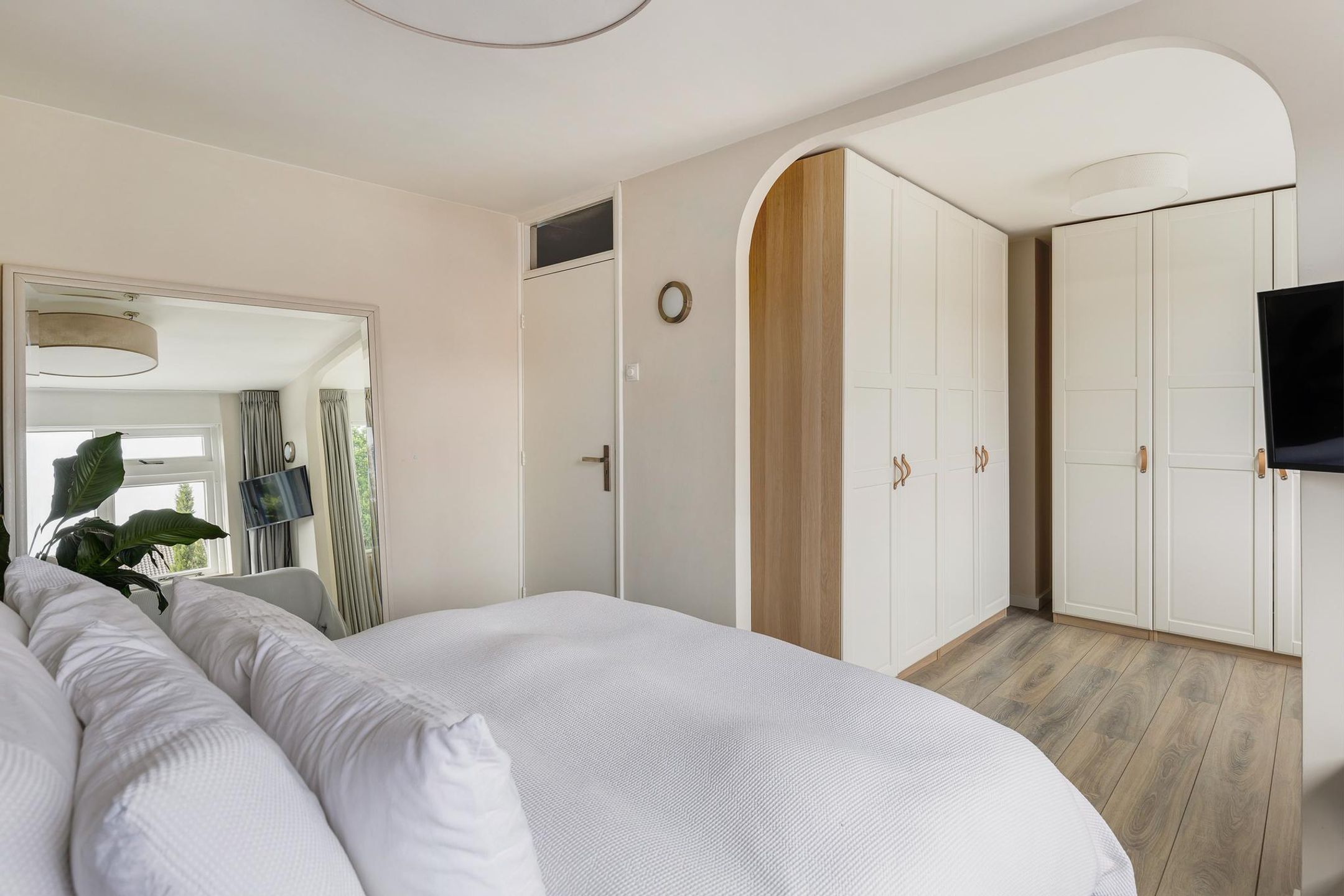 De “master bedroom” ligt aan de achterzijde van de woning. De huidige eigenaar heeft de oorspronkelijk derde slaapkamer bij de “master bedroom” getrokken waardoor dit een fijne ruime kamer wordt met kastruimte. Deze ruimte is voorzien van twee grote raampartijen.