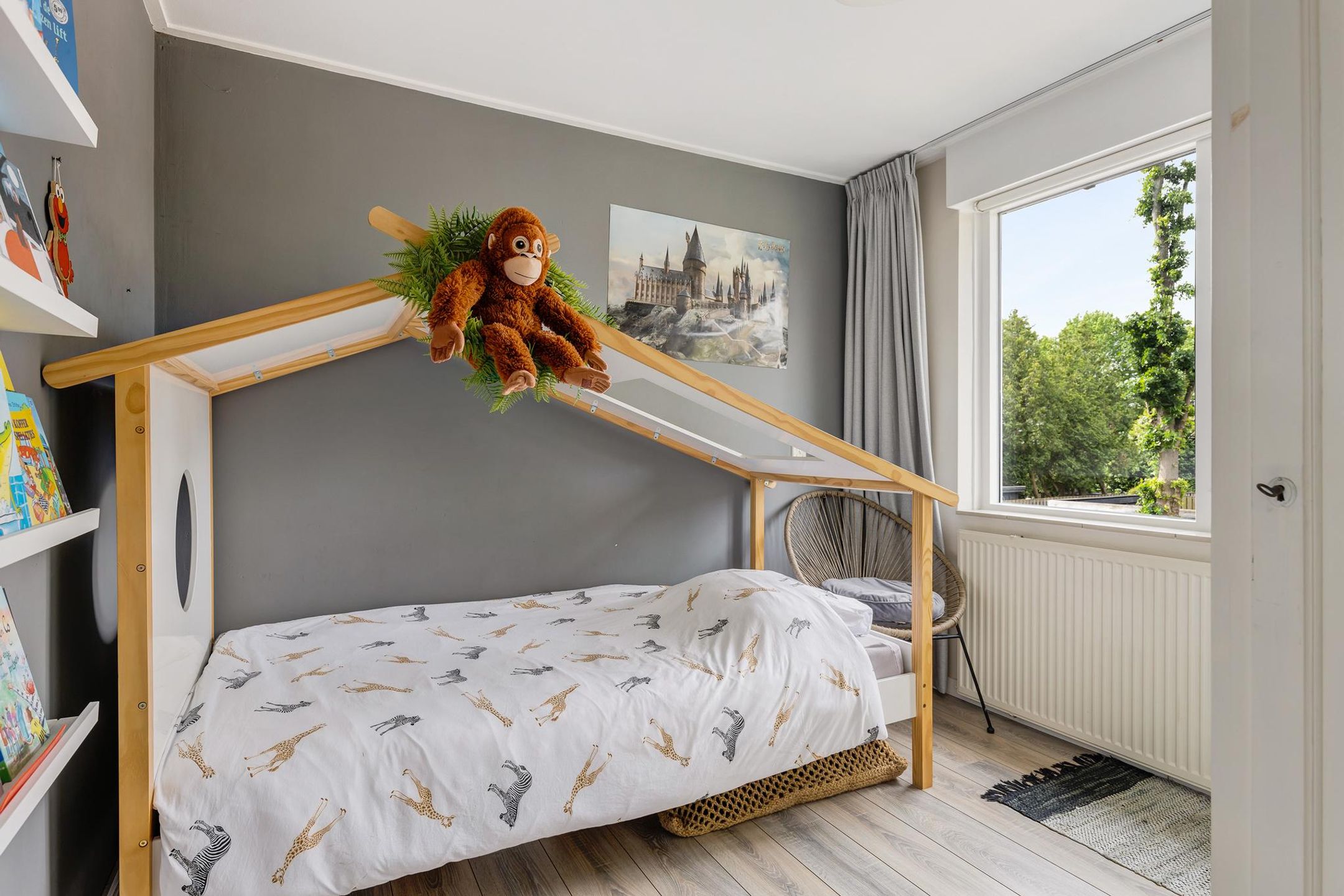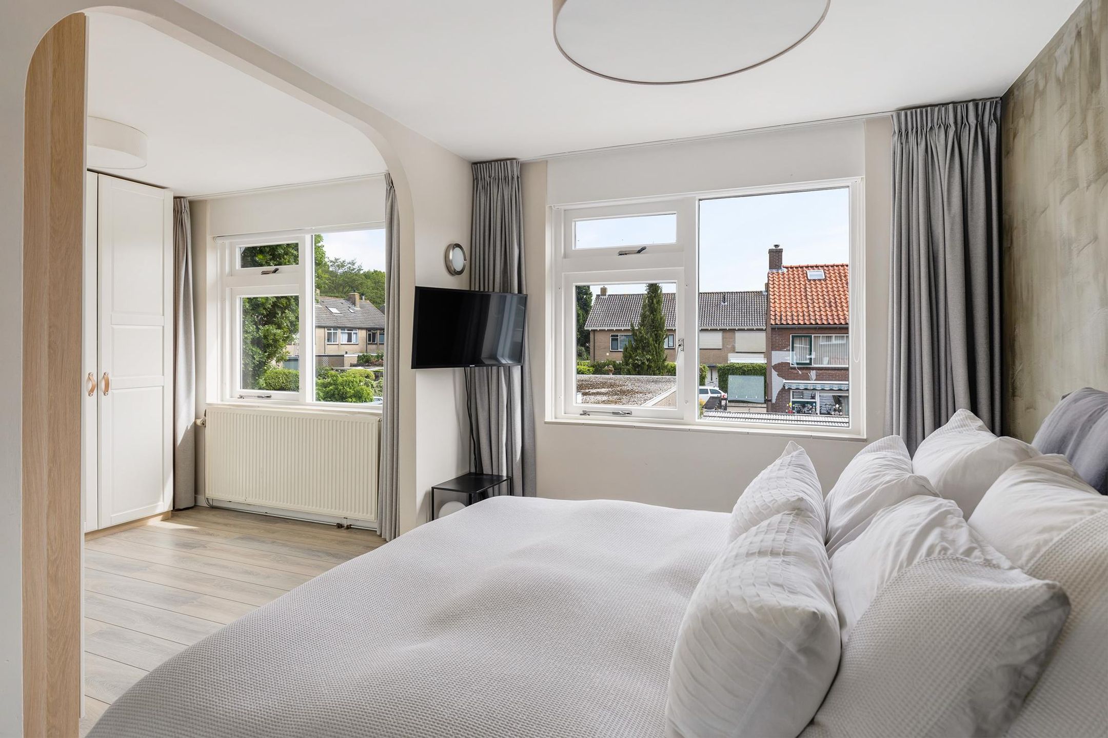 De tweede slaapkamer ligt aan de voorzijde van de woning en heeft middels een groot raampartij uitzicht op de voorgelegen, rustige, groene straat.