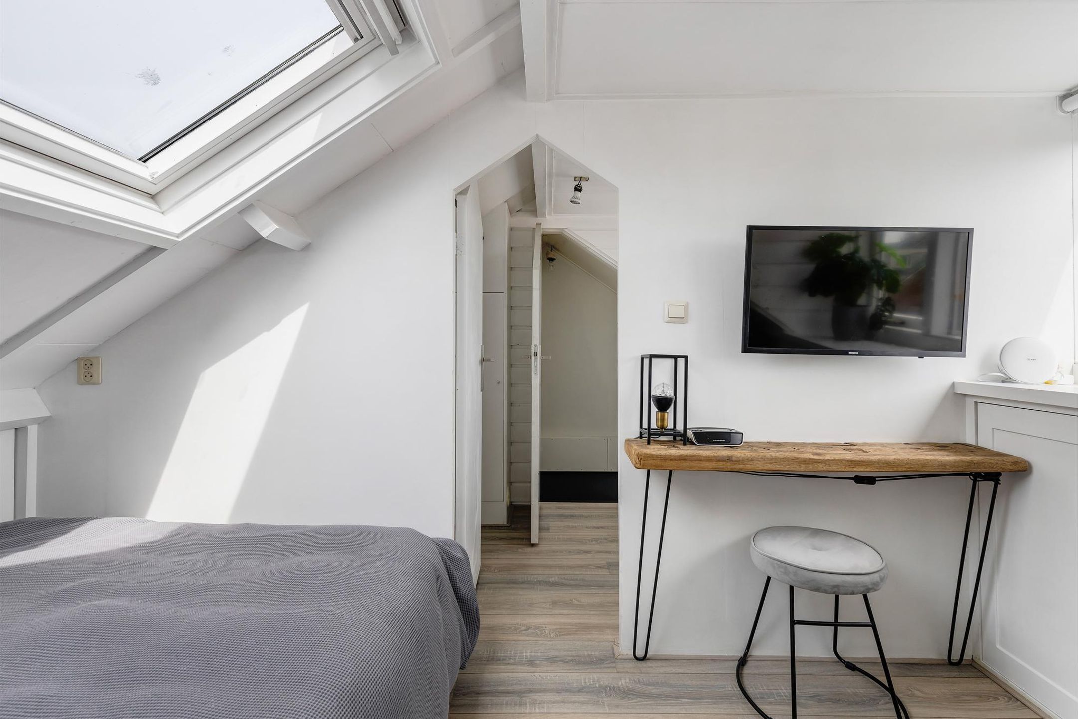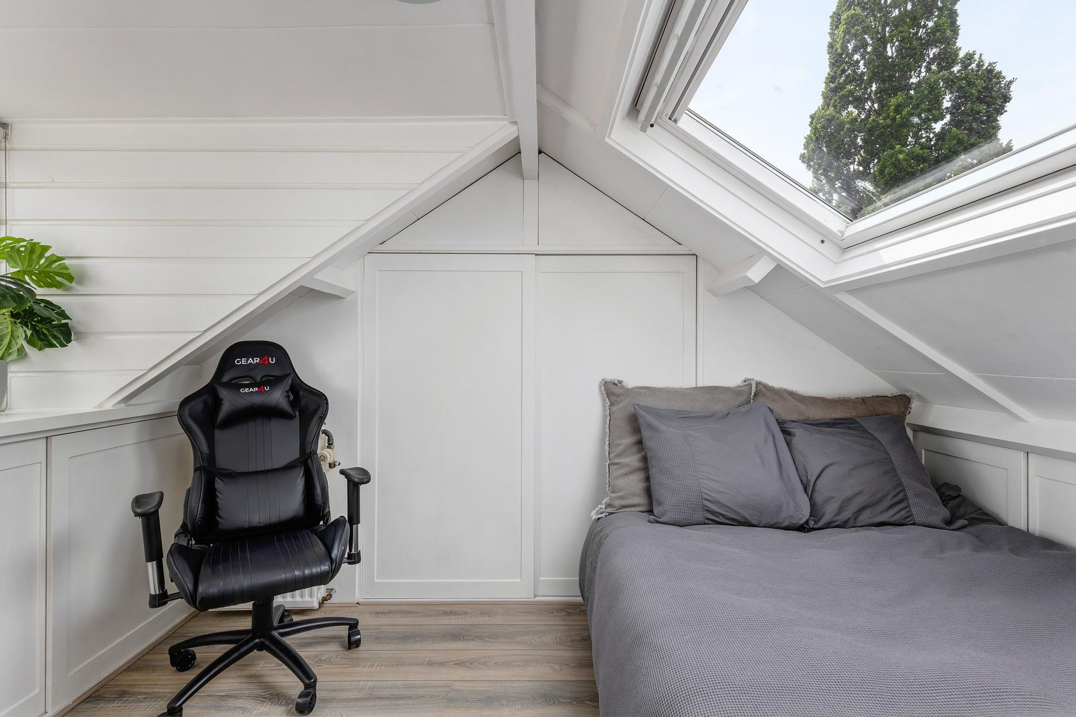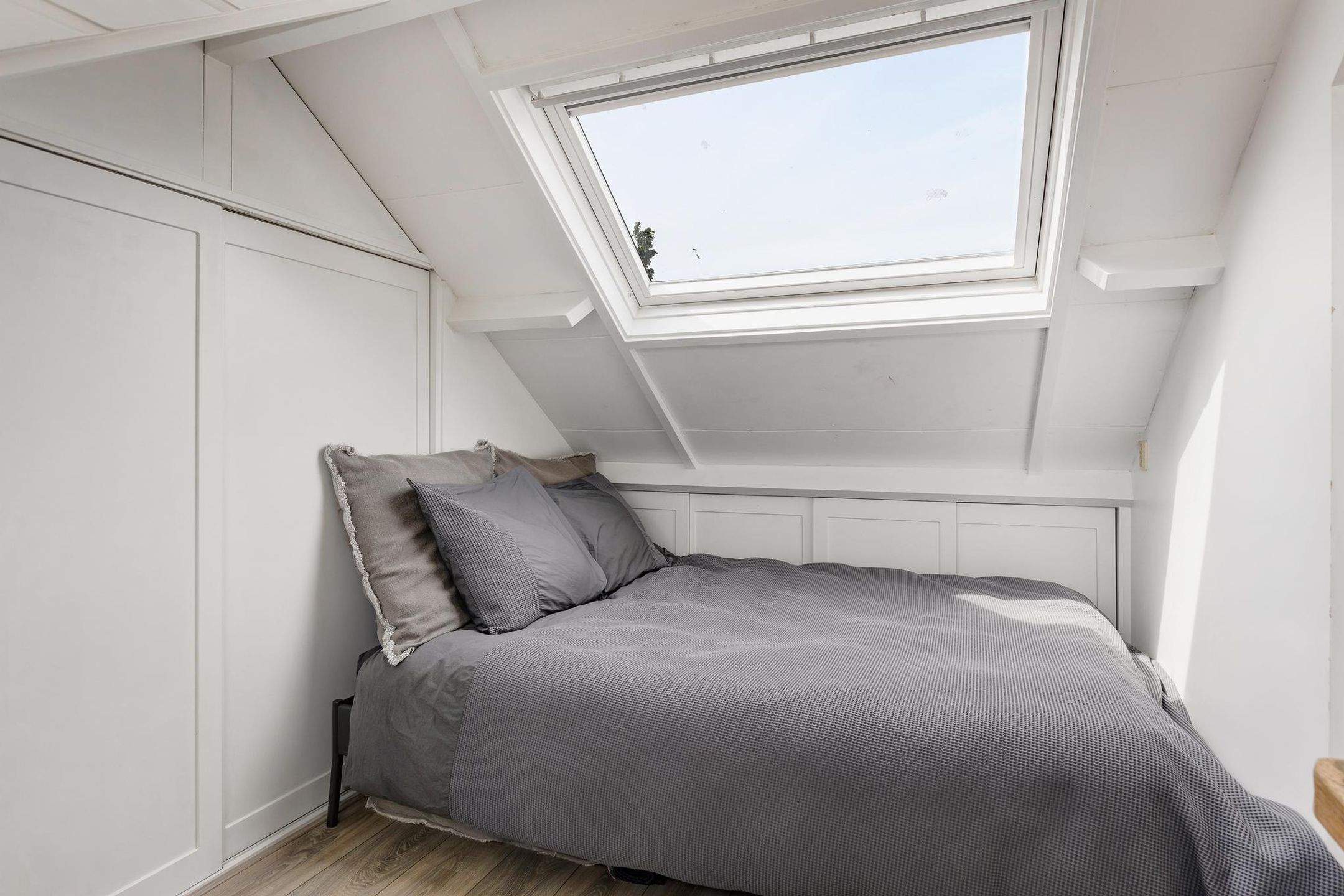 De derde slaapkamer is voorzien van een dakkapel aan de achterzijde van de woning en een Velux dakvenster aan de voorzijde. Ook hier is veel bergruimte aanwezig achter de knieschotten.