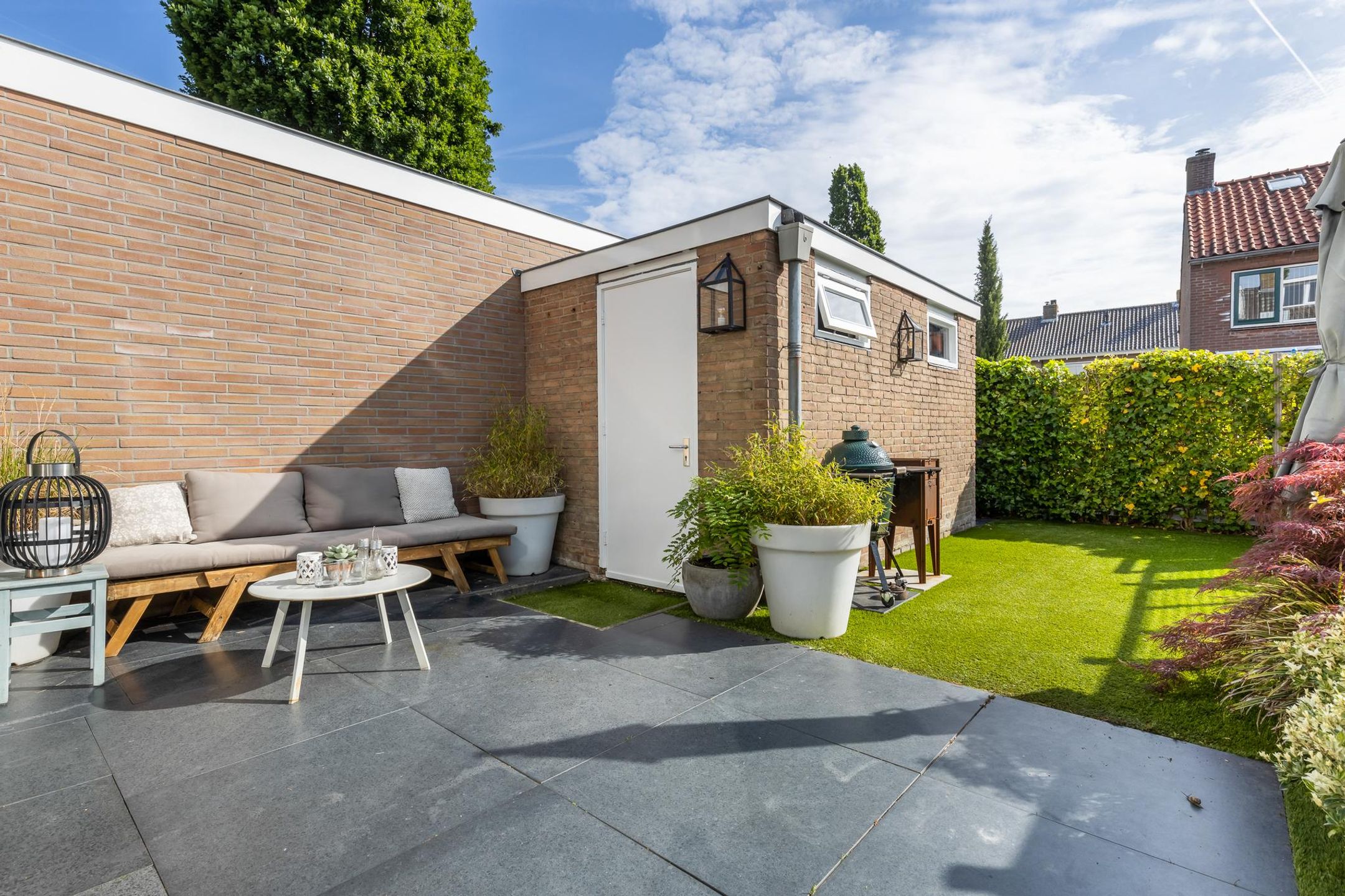 Ruime, zonnige achtertuin gelegen op het Oosten. De tuin is goed verzorgd met een terras voorzien van tegels, een gedeelte kunstgras, en heeft een fijne lounge hoek. De tuin beschikt over een stenen berging voorzien van elektra.
