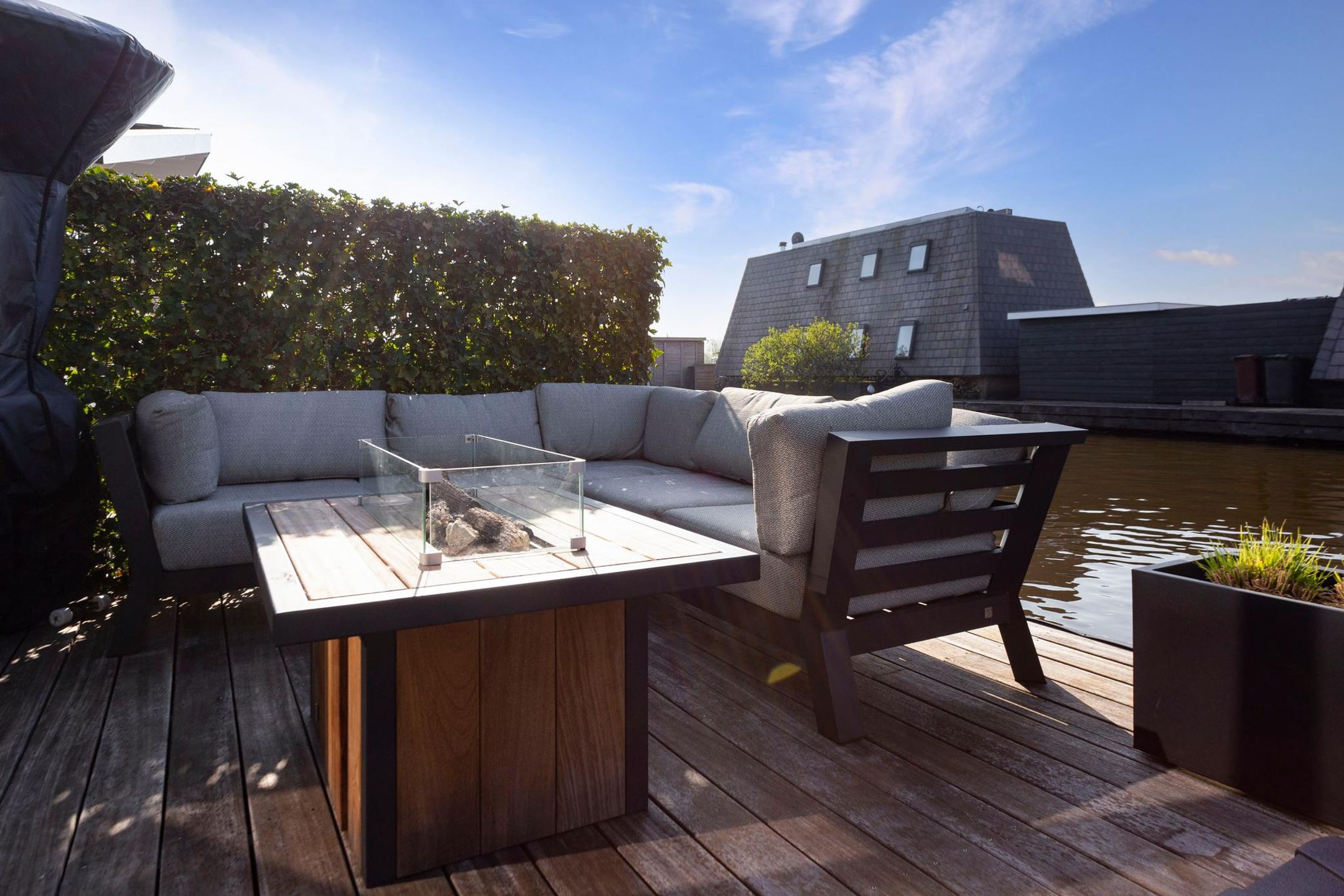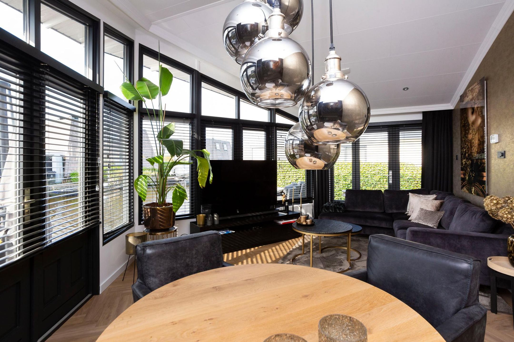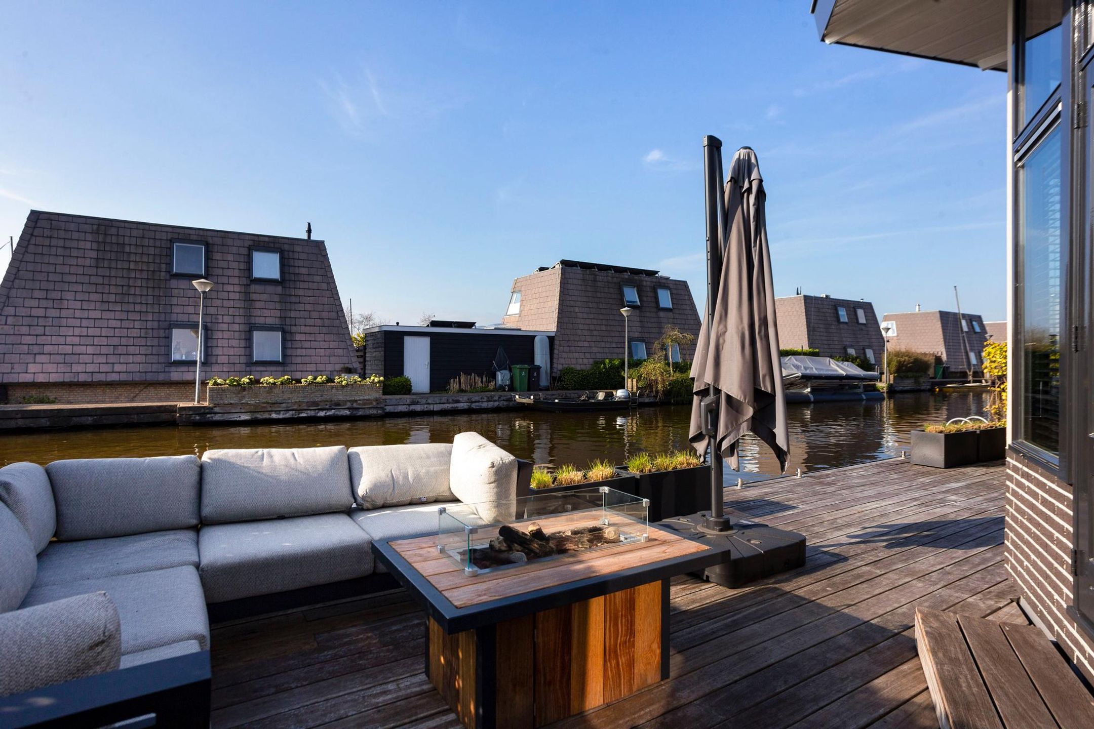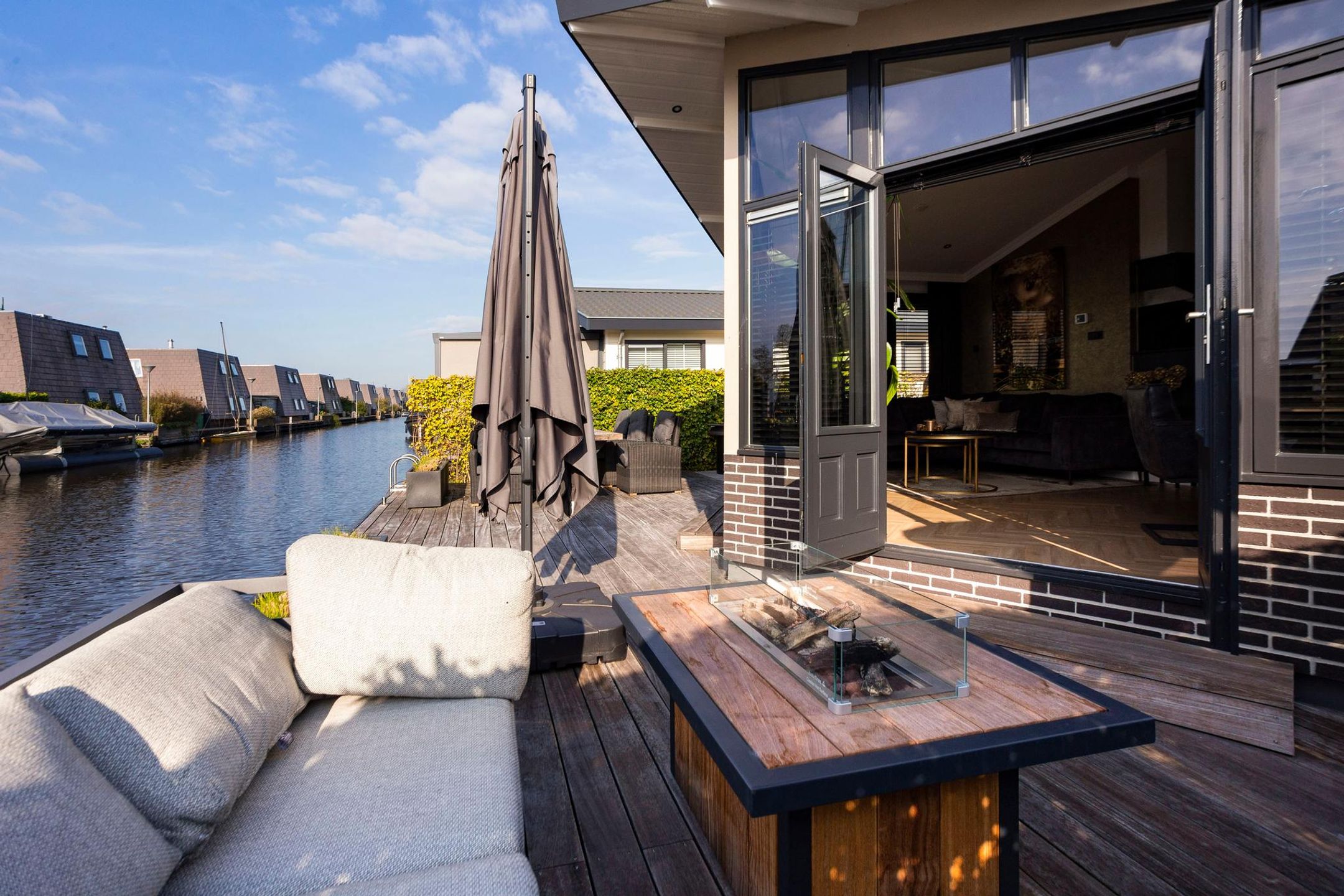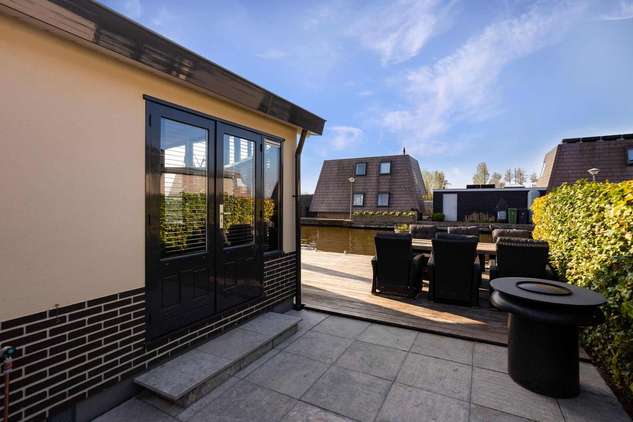Entree, hal met doorgang naar de keuken welke grenst aan de ruimte, lichte woonkamer met uitzicht over het water en het zonnige terras. De woonkamer is voorzien van een visgraat-houten vloer en grote raampartijen waardoor de ruimte veel licht binnenlaat. Tevens beschikt de woonkamer over 3 openslaande deuren naar het terras/de tuin. De keuken beschikt over een ingebouwde combi oven-magnetron, vaatwasmachine, koelkast, 4-pits inductiekookplaat en een afzuigkap.