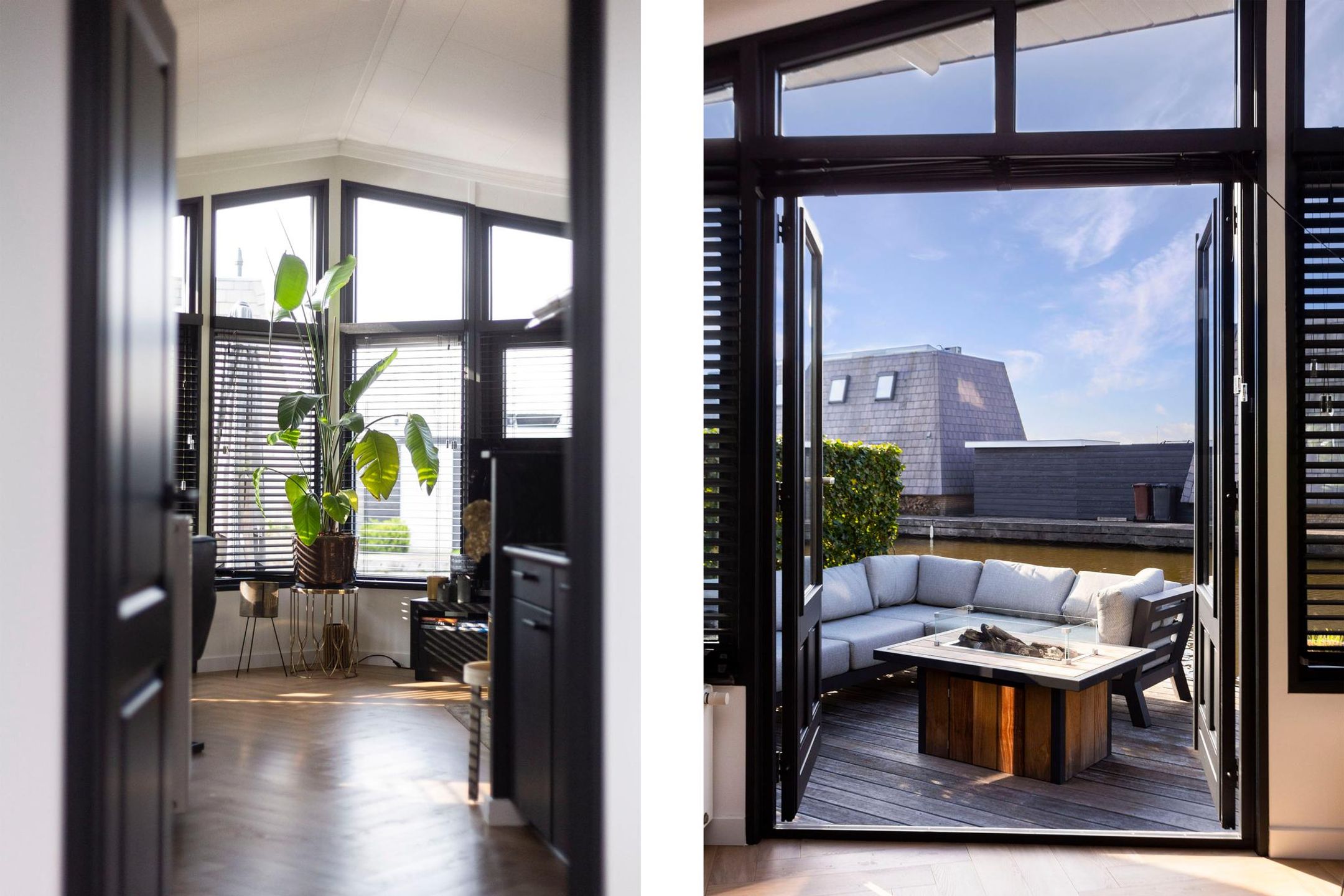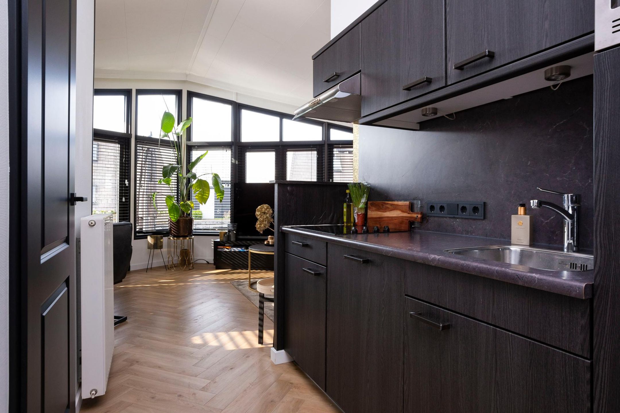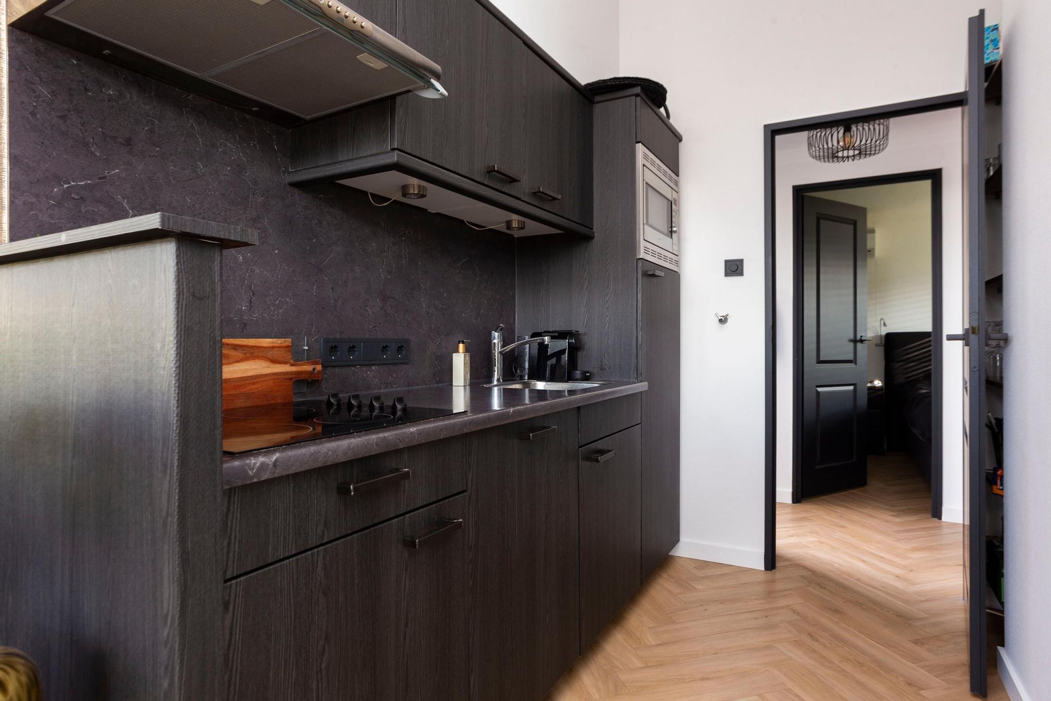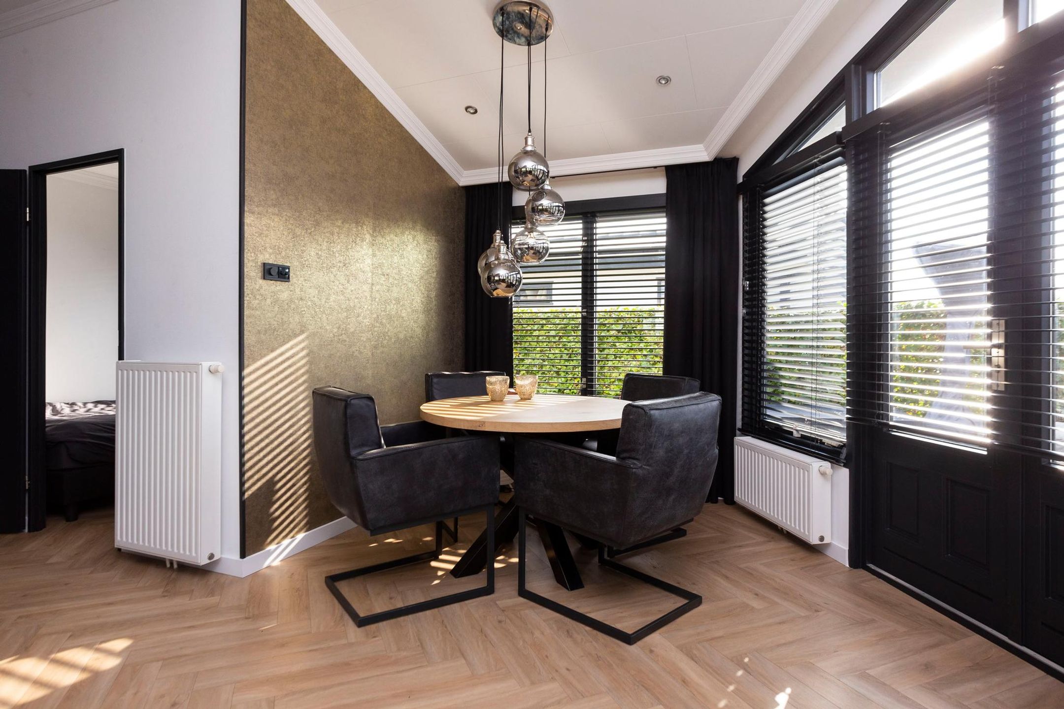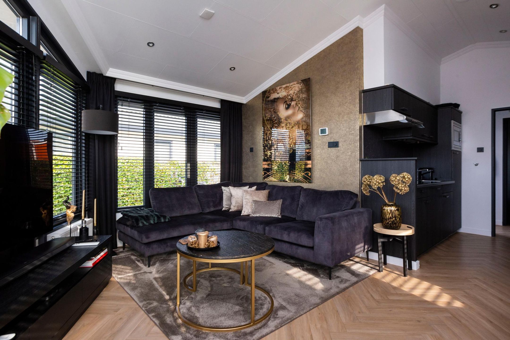 Entree, hal met doorgang naar de keuken welke grenst aan de ruimte, lichte woonkamer met uitzicht over het water en het zonnige terras. De woonkamer is voorzien van een visgraat-houten vloer en grote raampartijen waardoor de ruimte veel licht binnenlaat. Tevens beschikt de woonkamer over 3 openslaande deuren naar het terras/de tuin. De keuken beschikt over een ingebouwde combi oven-magnetron, vaatwasmachine, koelkast, 4-pits inductiekookplaat en een afzuigkap.