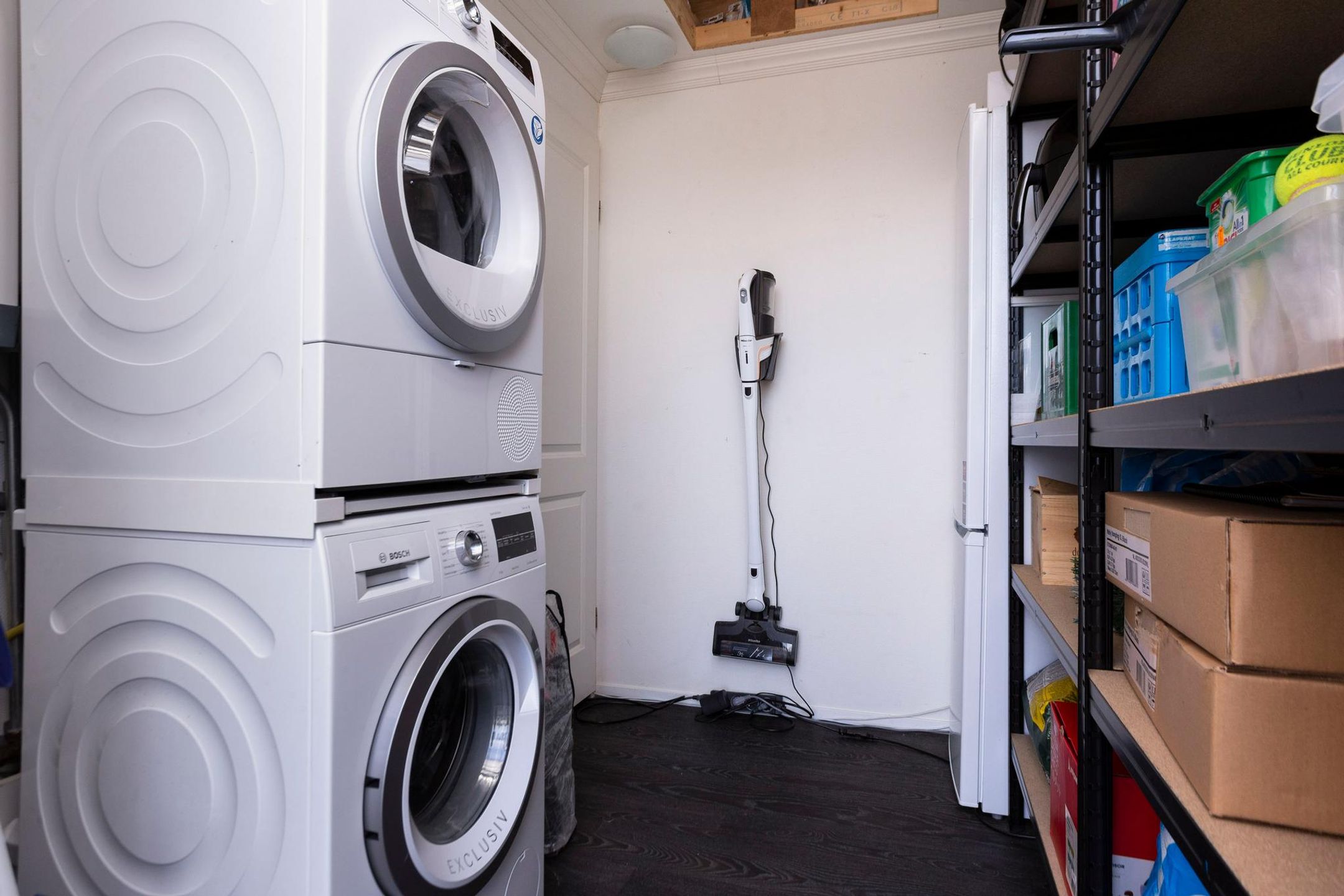 Tevens beschikt u over een riante berging/schuur voor de opslag van uw fietsen en tuinmeubelen. Deze is te bereiken via de voorzijde van de woning, naast de entree. Hier bevinden zich de technische installaties en de aansluitingen voor een was/droog machine.