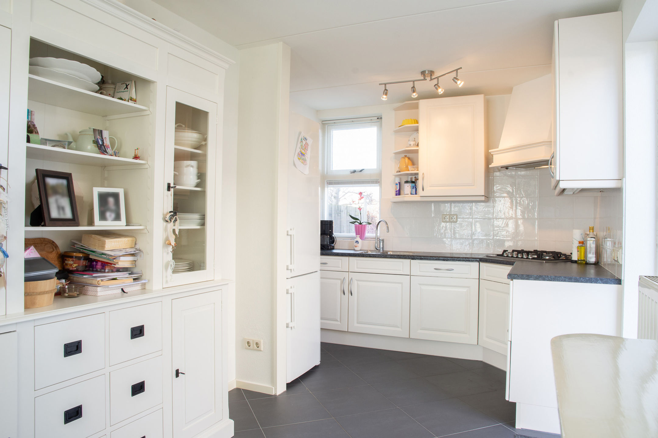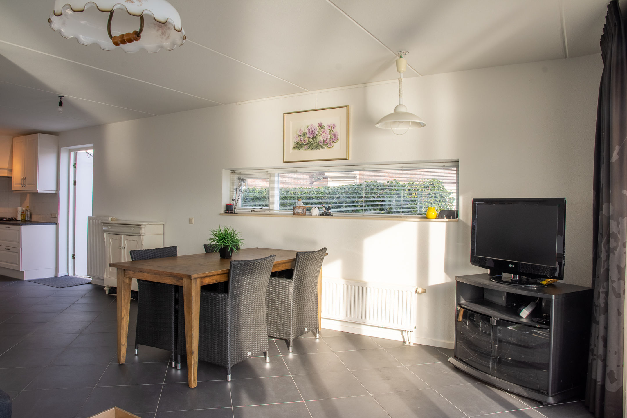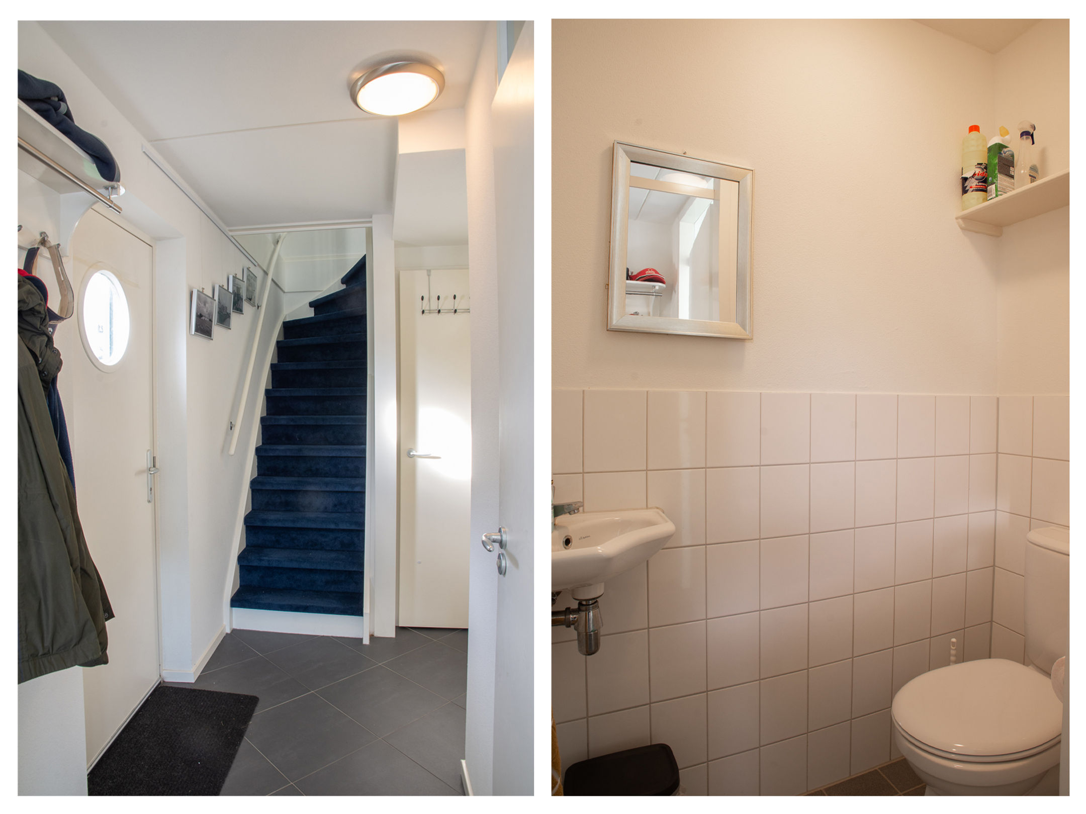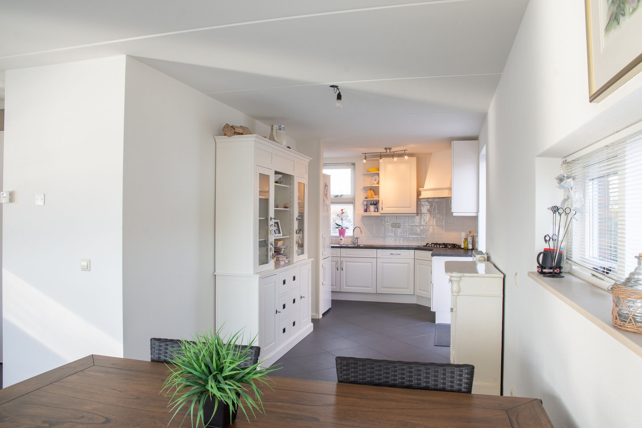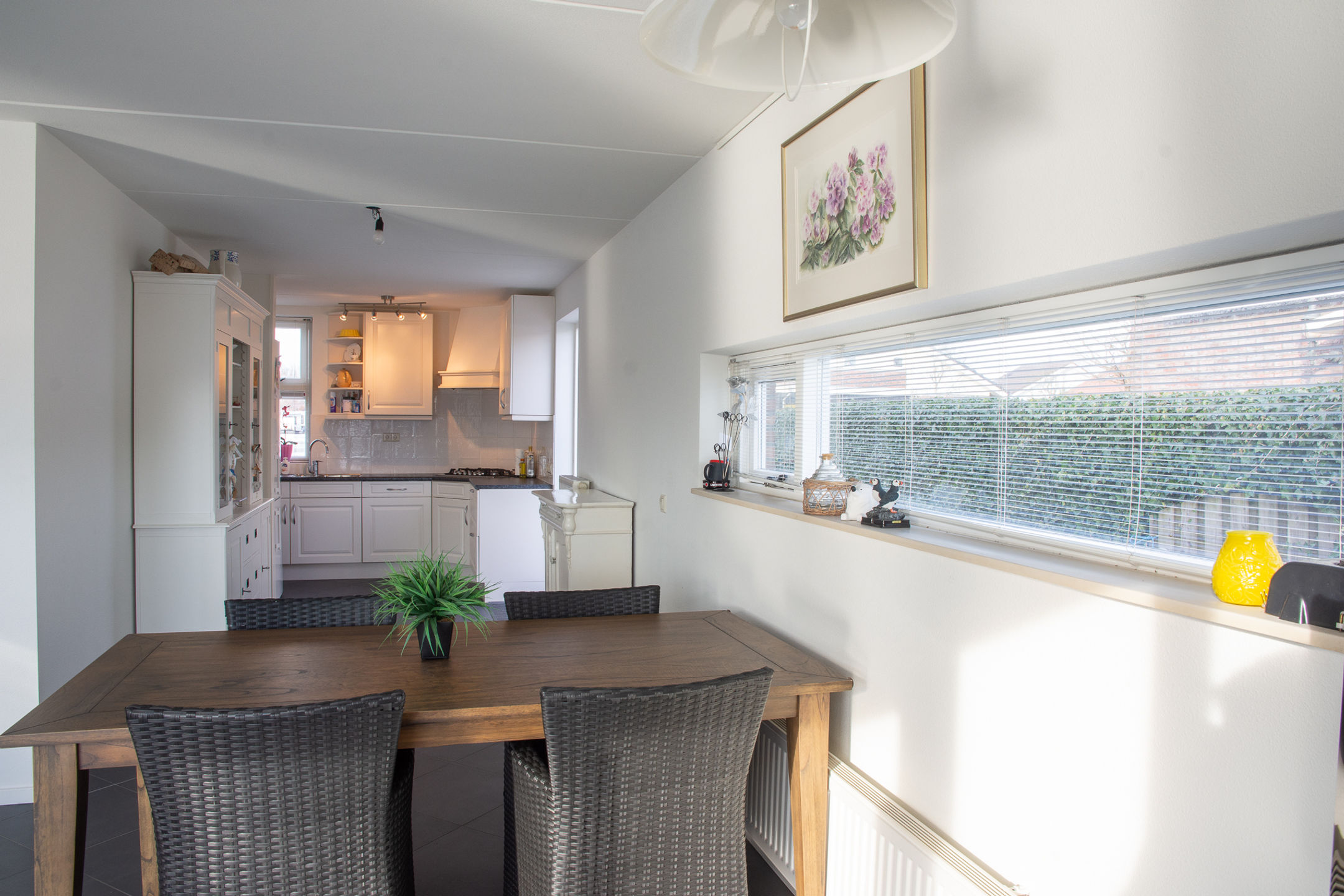 Begane grond: entree/hal met meterkast, separaat toilet met fonteintje, woonkamer met schuifpui naar het terras, veel lichtinval door de zijramen en de grote schuifpui. De woonkamer is voorzien van een plavuizen vloer. De open keuken is voorzien van diverse inbouwapparatuur zoals een koelkast/ vriezer, inductiekookplaat, afzuigkap, vaatwasser. Aan de voorzijde van de woning is een handige inpandige berging met hier de technische ruimte (CV ketel Remeha Calenta 2010) tevens hier ook de aansluitingen voor de wasmachine.