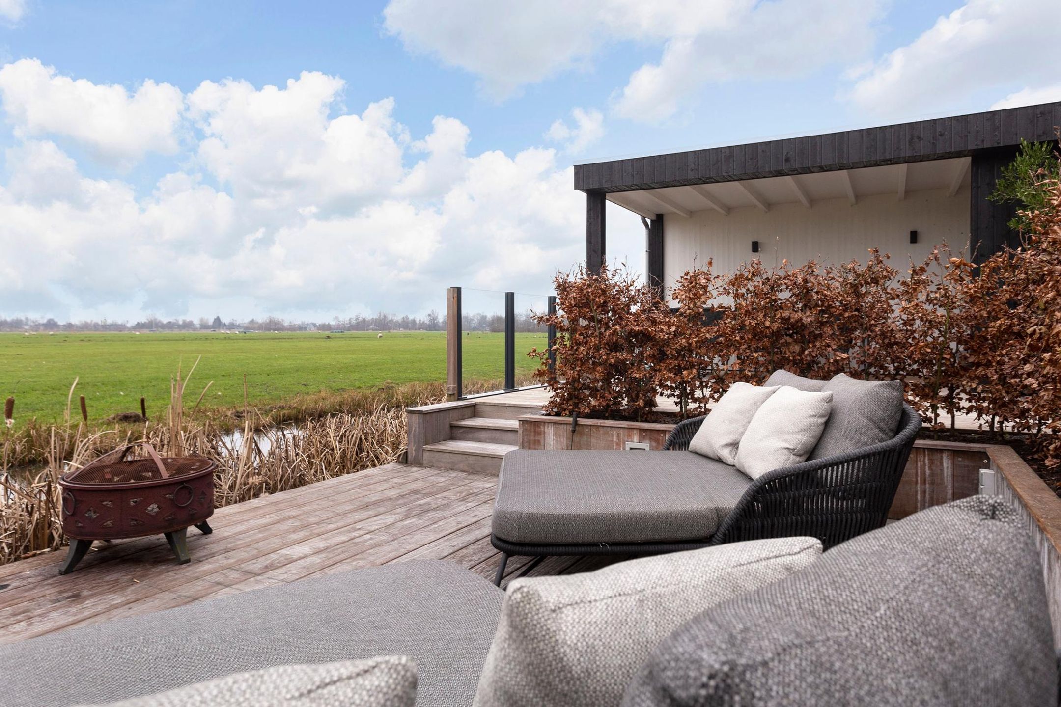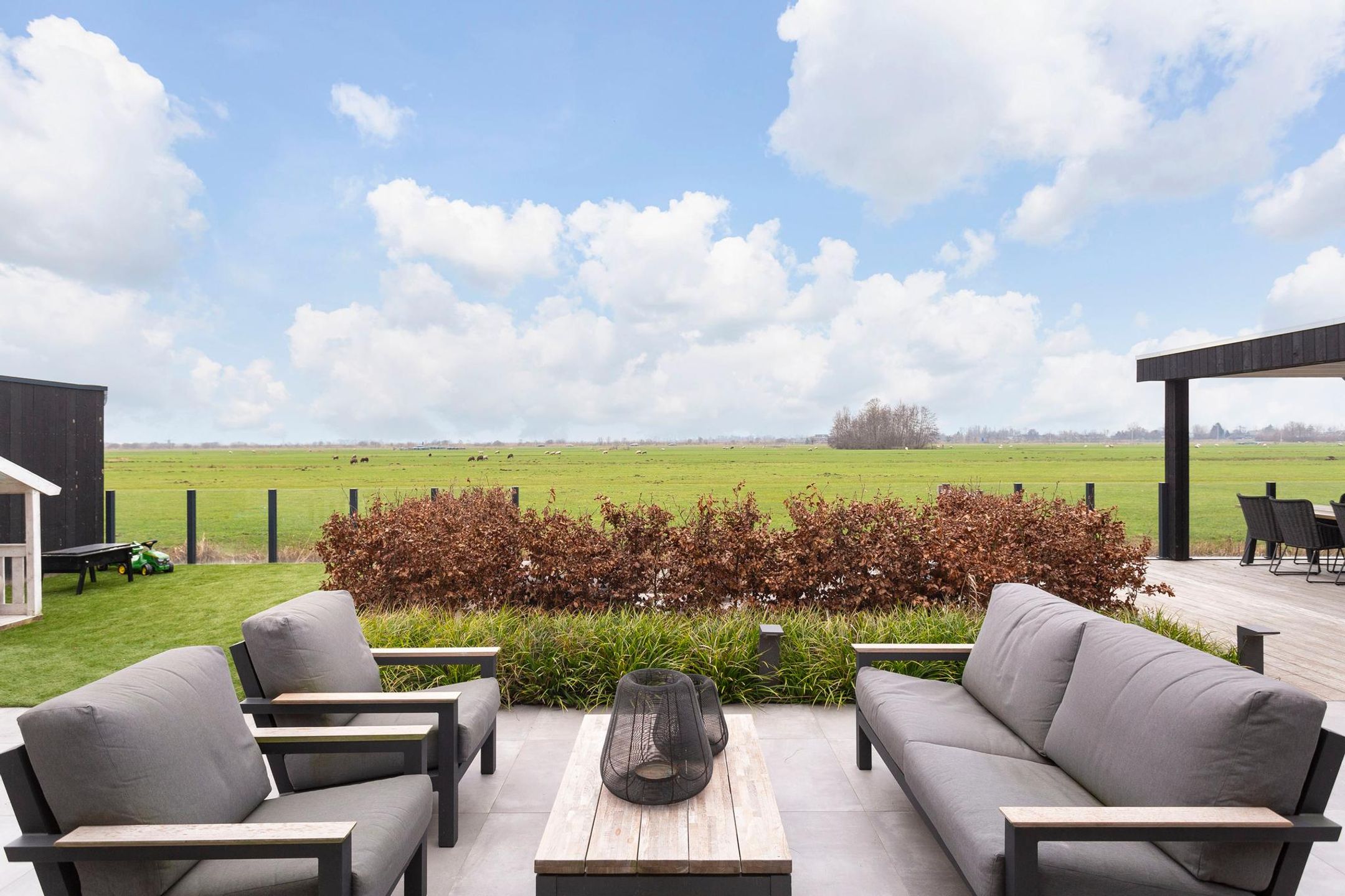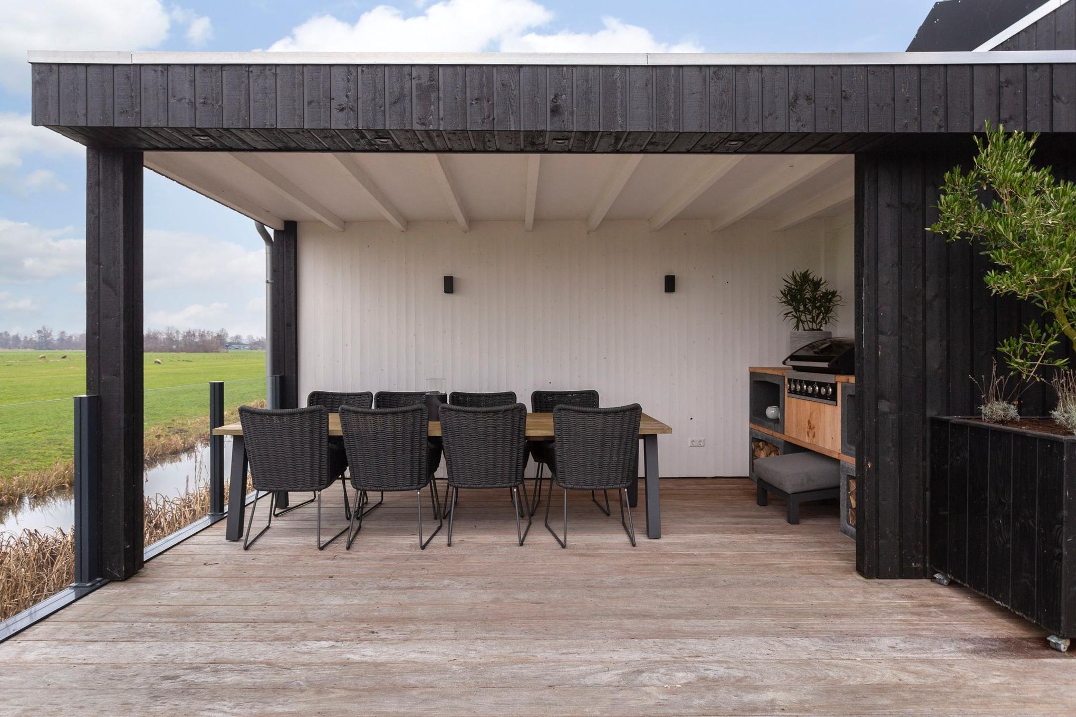 De ruime achtertuin is op het Noord-Westen gelegen en beschikt over meerdere zonnige terrassen. Een terras aangrenzend door openslaande deuren aan de woon-eetkeuken en een verlaagt terras aan het water. Op het perceel is een fraaie, grote schuur/garage gebouwd met een heerlijke overkapping aan de weiland zijde waar u kunt genieten aan een lange tafel, dineren met familie en vrienden. Ver hoeft u niet te lopen naar de keuken in de woning want deze veranda is voorzien van een fraaie buitenkeuken! U heeft hier veel privacy en uitzicht over de groene omgeving.
