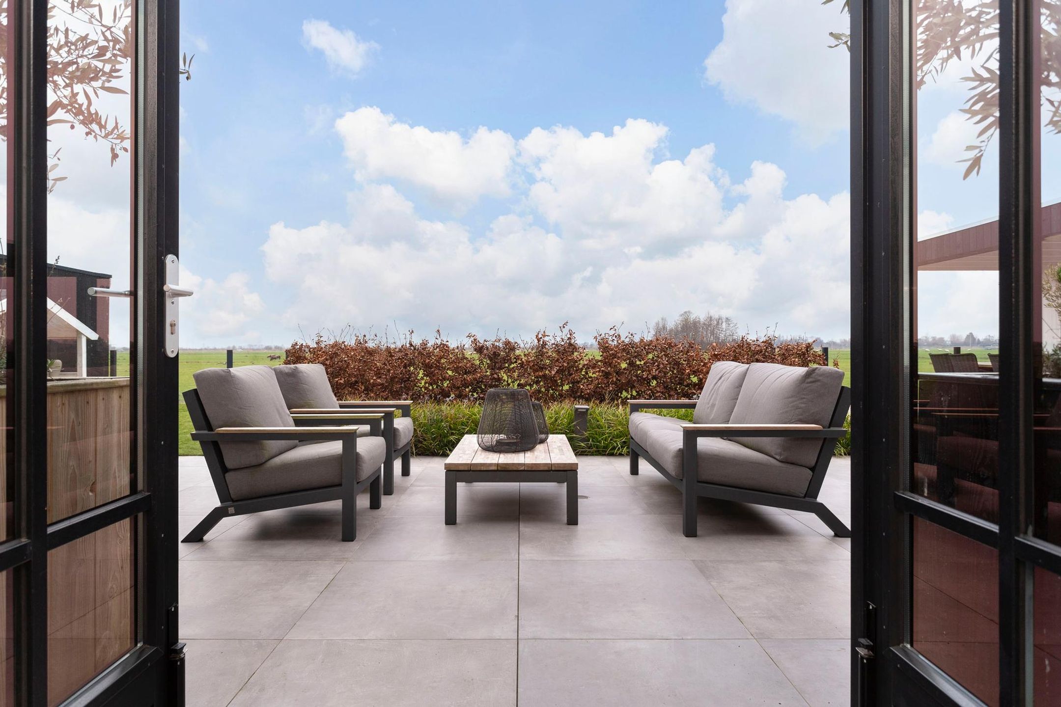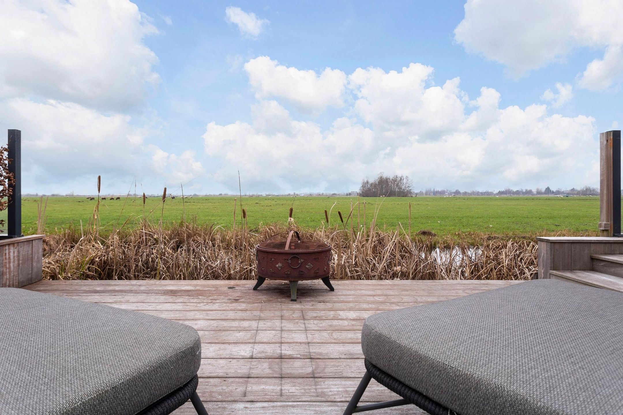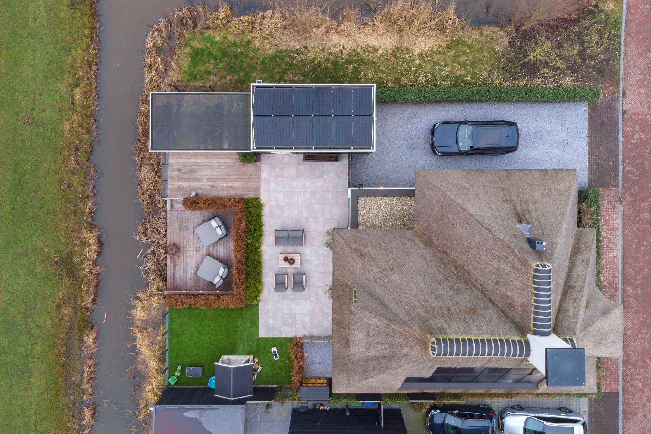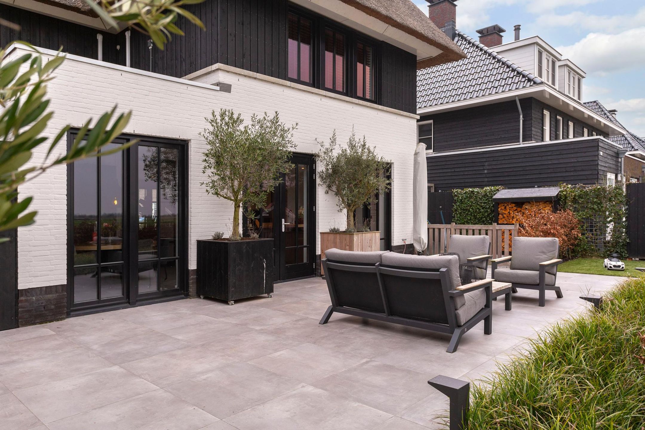 De ruime achtertuin is op het Noord-Westen gelegen en beschikt over meerdere zonnige terrassen. Een terras aangrenzend door openslaande deuren aan de woon-eetkeuken en een verlaagt terras aan het water. Op het perceel is een fraaie, grote schuur/garage gebouwd met een heerlijke overkapping aan de weiland zijde waar u kunt genieten aan een lange tafel, dineren met familie en vrienden. Ver hoeft u niet te lopen naar de keuken in de woning want deze veranda is voorzien van een fraaie buitenkeuken! U heeft hier veel privacy en uitzicht over de groene omgeving.