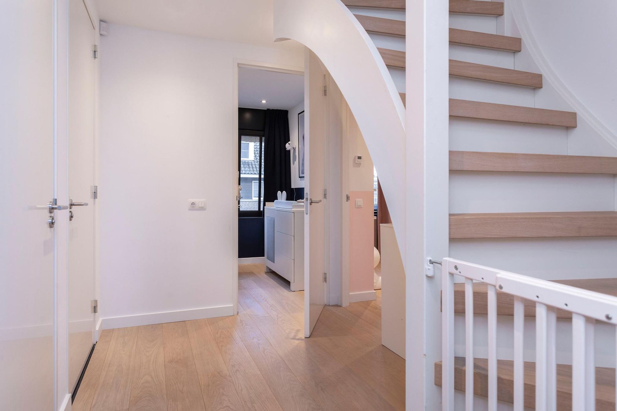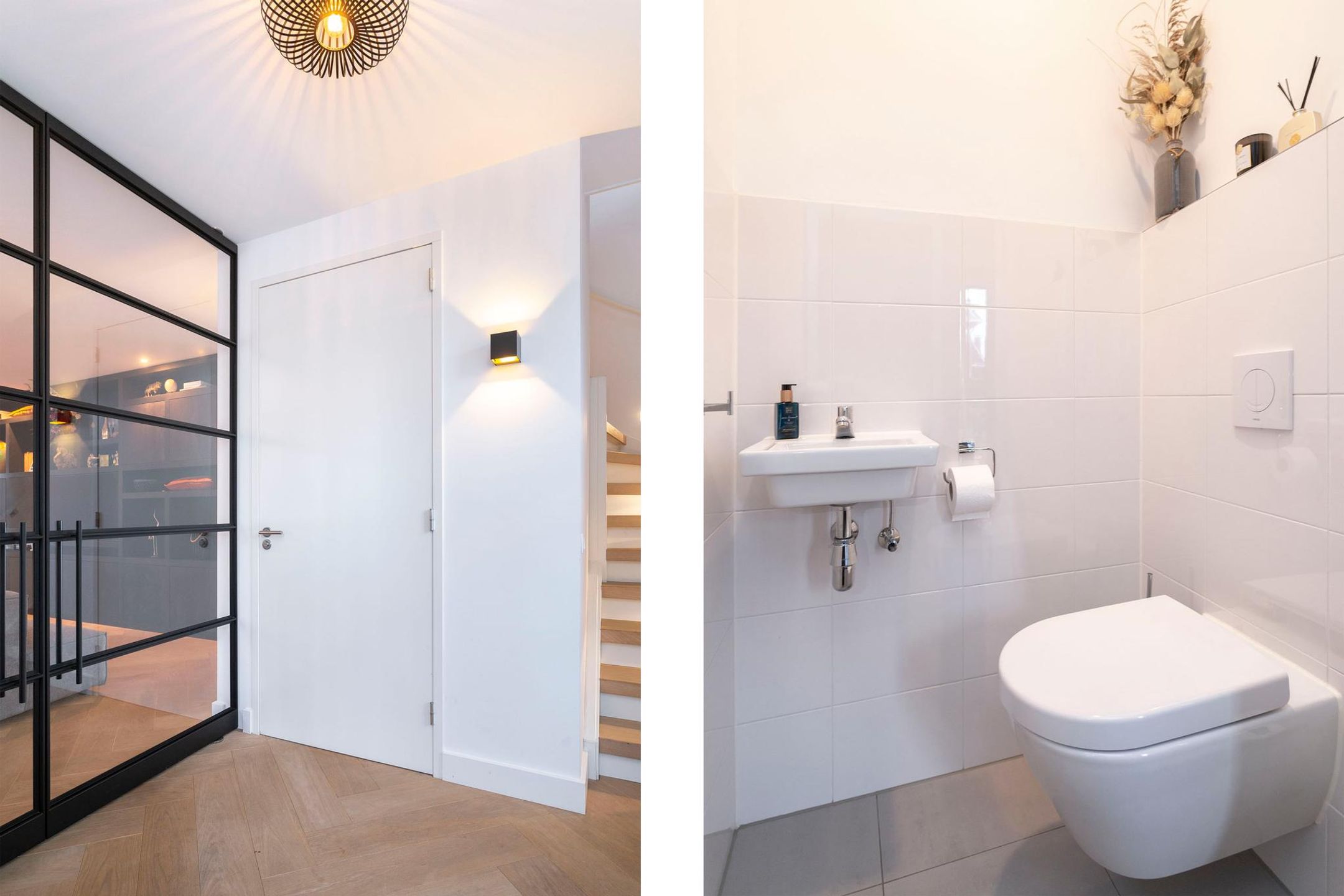 Entree, royale hal met garderobe, fraaie trap naar de verdieping, toiletruimte met toilet en fonteintje, doorgang via openslaande, moderne taatsdeuren naar de woonkamer.