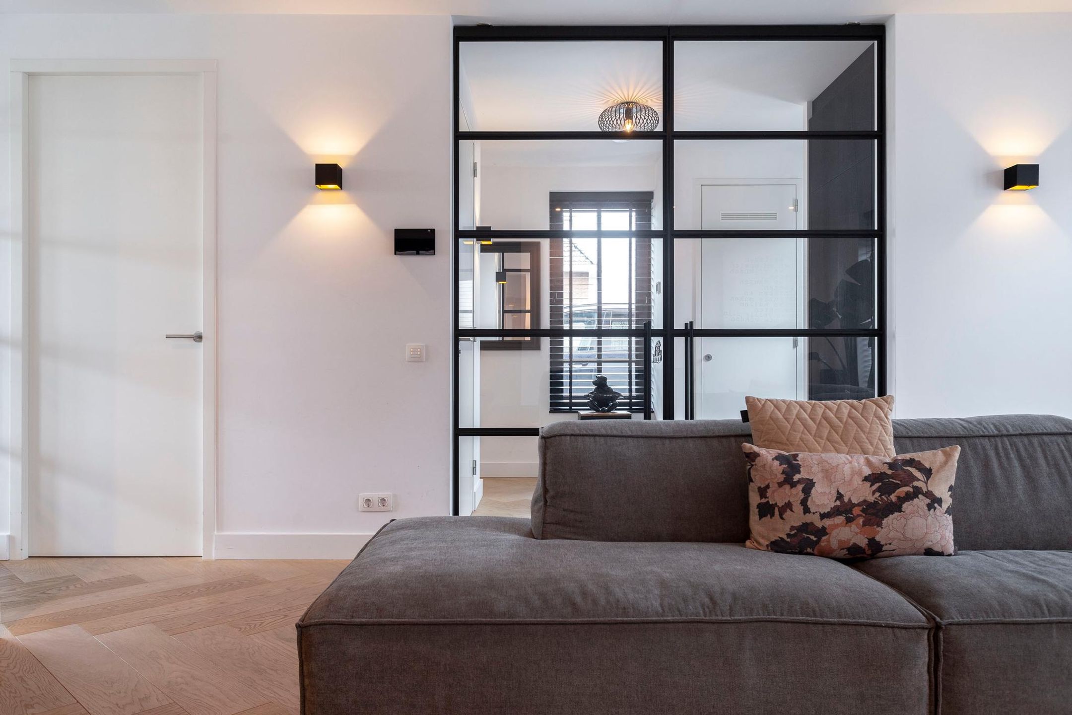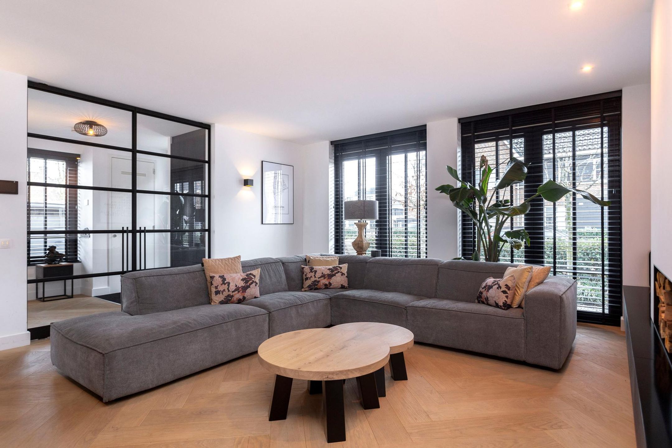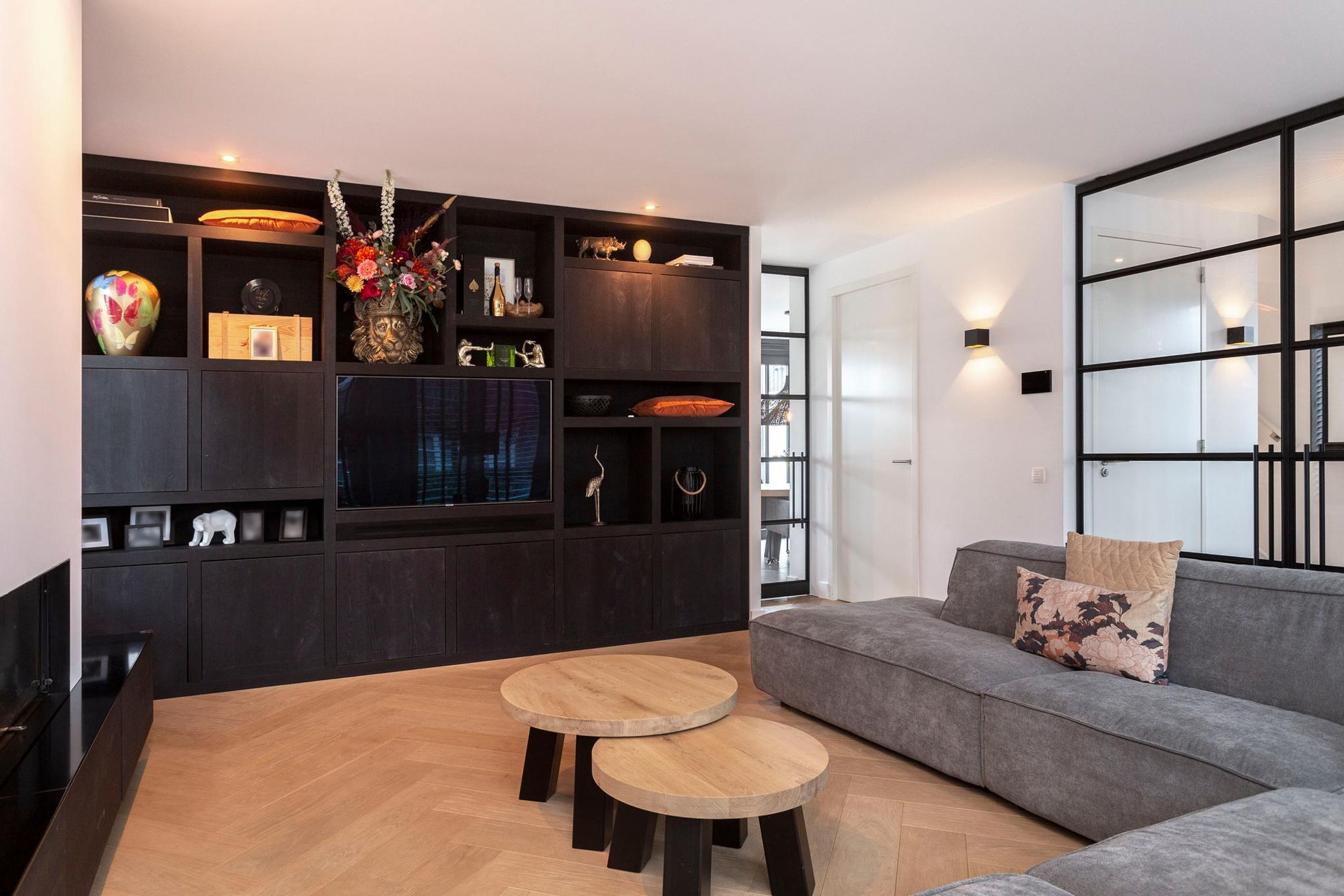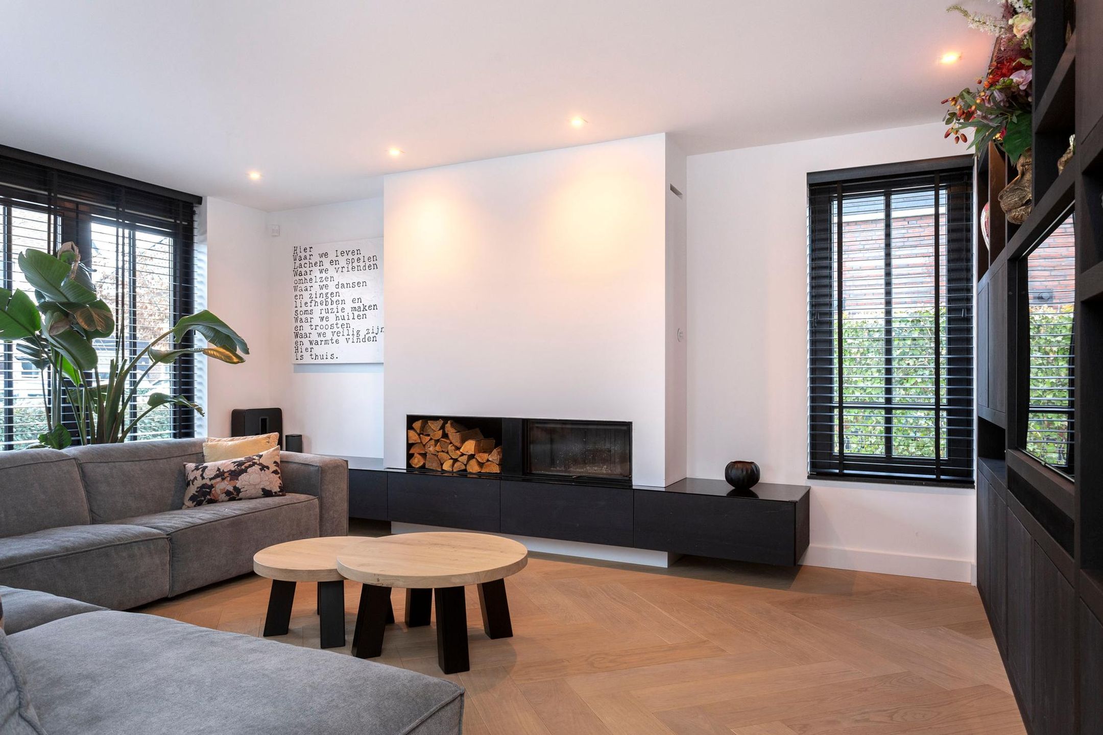Een lichte, ruime living welke is voorzien van een sfeervolle haard, en ingebouwde, op maat gemaakte kastenwand waar ook de televisie is ingebouwd. Deze kamer is voorzien van een strakke en rustige afwerking met een houten-visgraat-parketvloer.