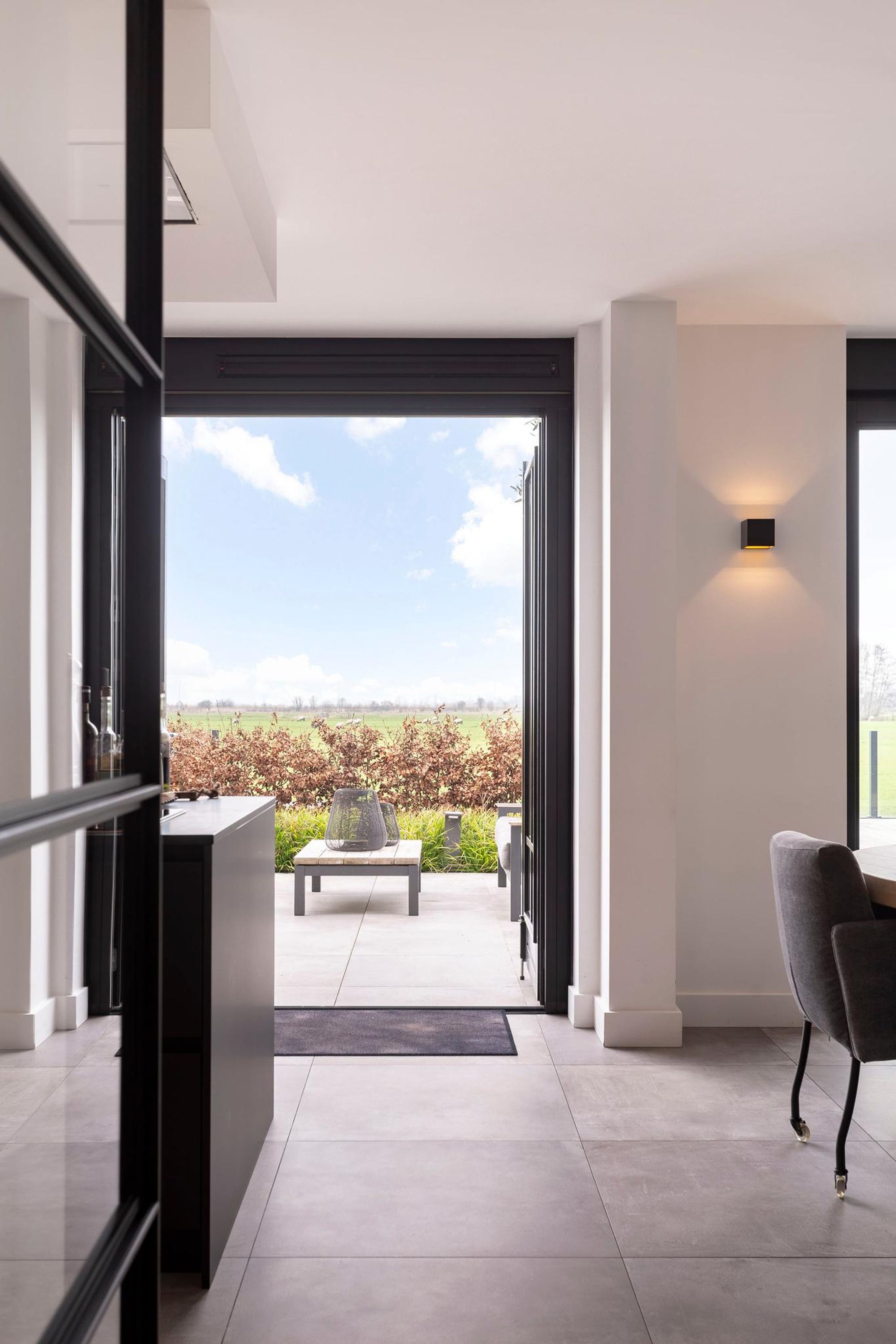 De woon-eetkeuken is voorzien van keramische tegels welke ook doorlopen op het aansluitende terras.