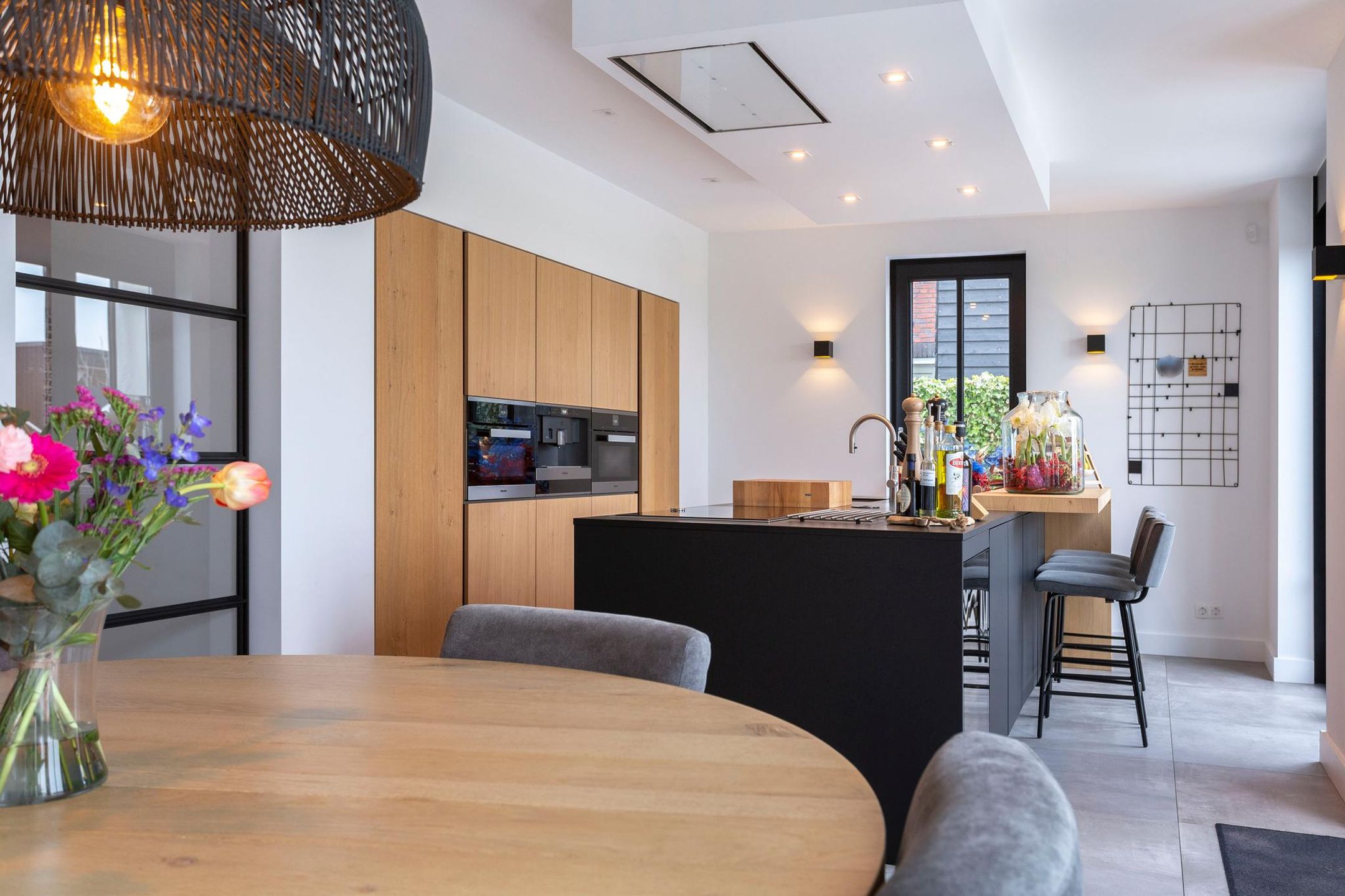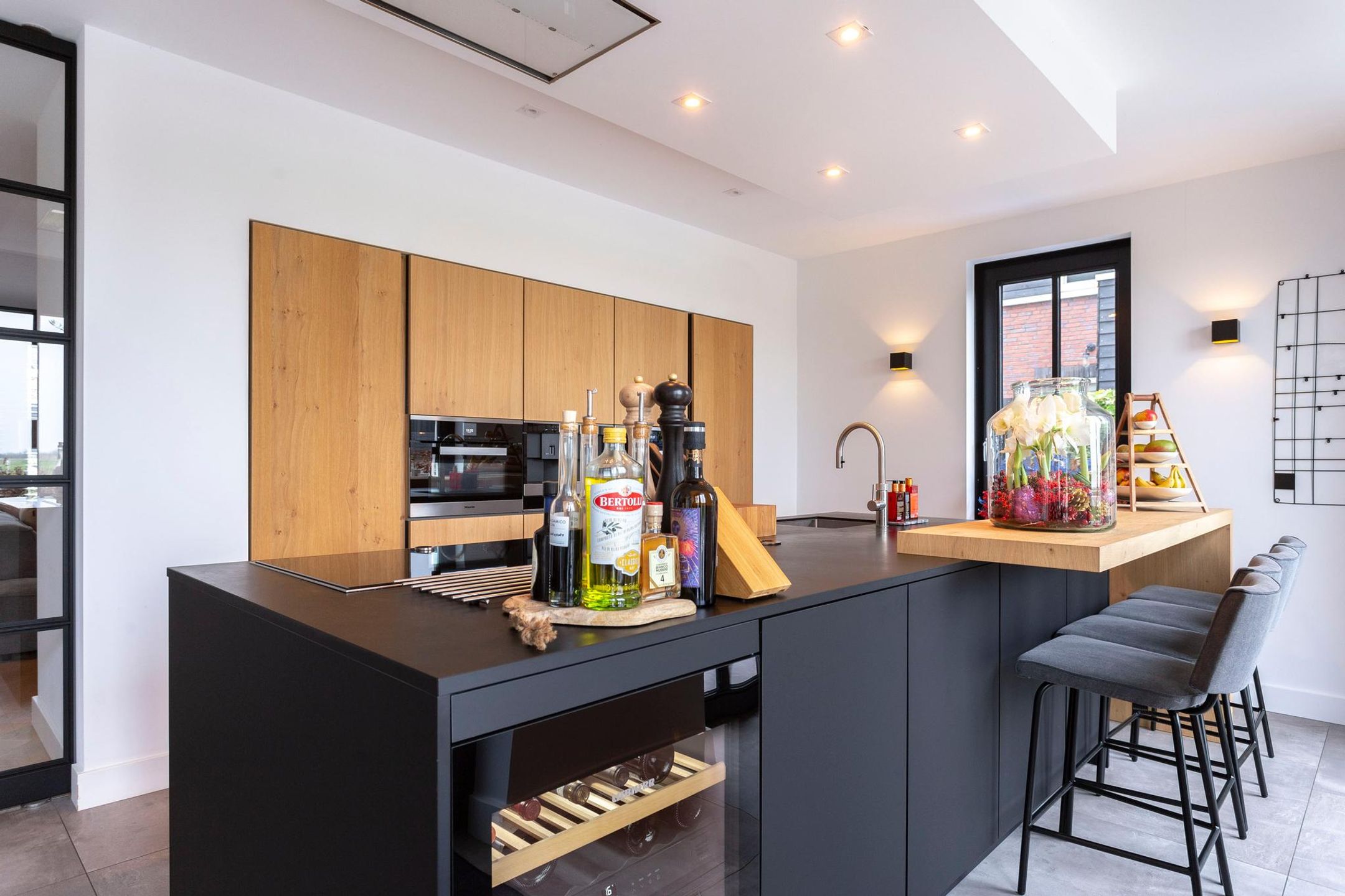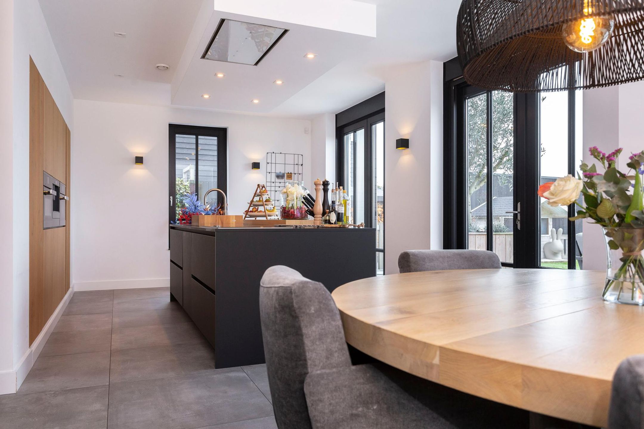 Via de woonkamer komt u in de woon-eetkeuken. Hier bevinden zich twee openslaande deuren naar de achtertuin. De moderne keuken (Exclusieve Barletti design keuken) met kookeiland voorziet u van veel kastruimte en de benodigde inbouwapparatuur zoals een oven, combi oven-magnetron, vaatwasser, koelkast, vriezer, spoelgelegenheid met cooker en een wijnklimaatkast. Het kookgedeelte is een inductie kookplaat met ingebouwde afzuiging in het plafond.