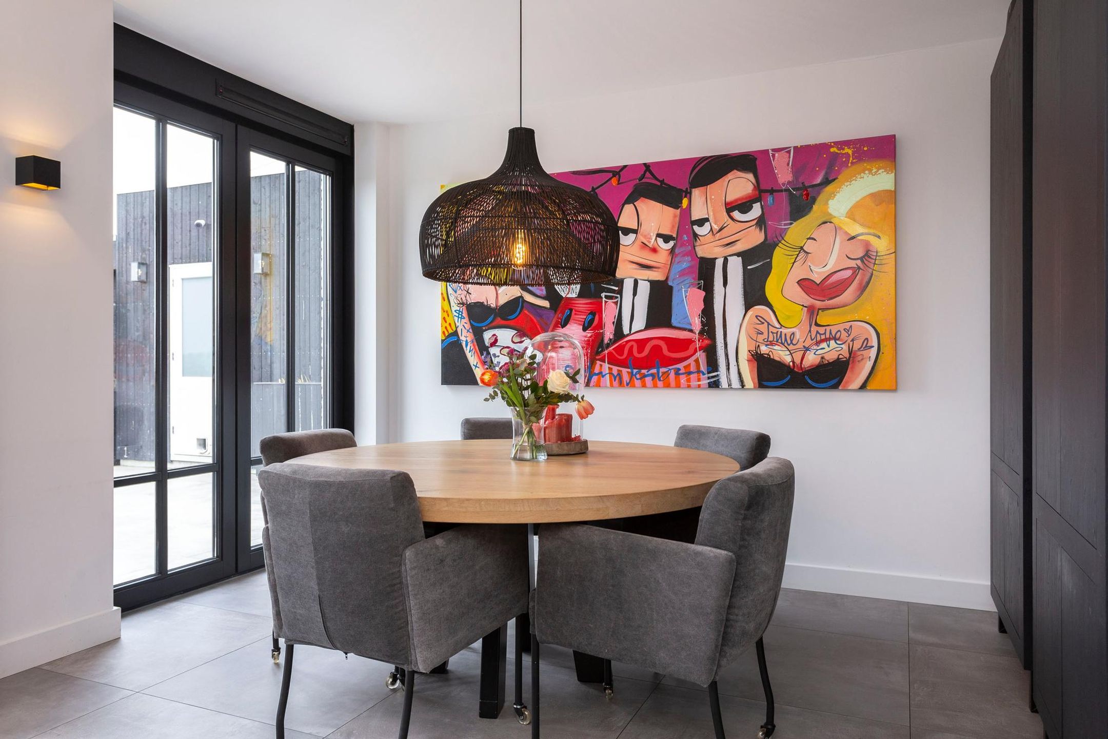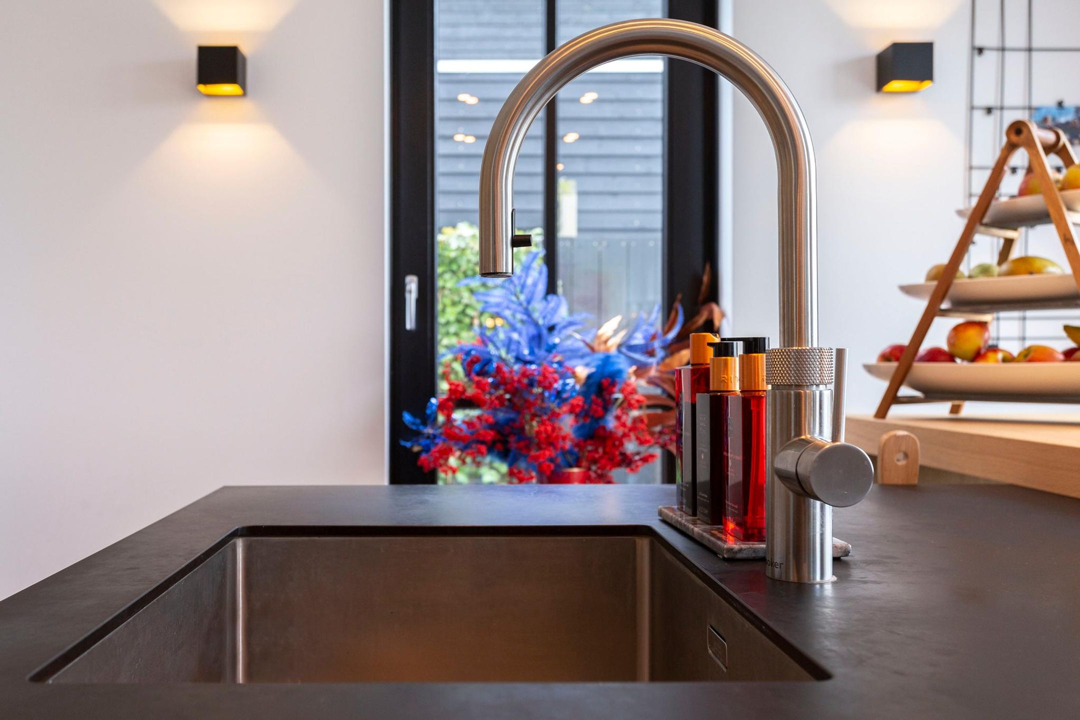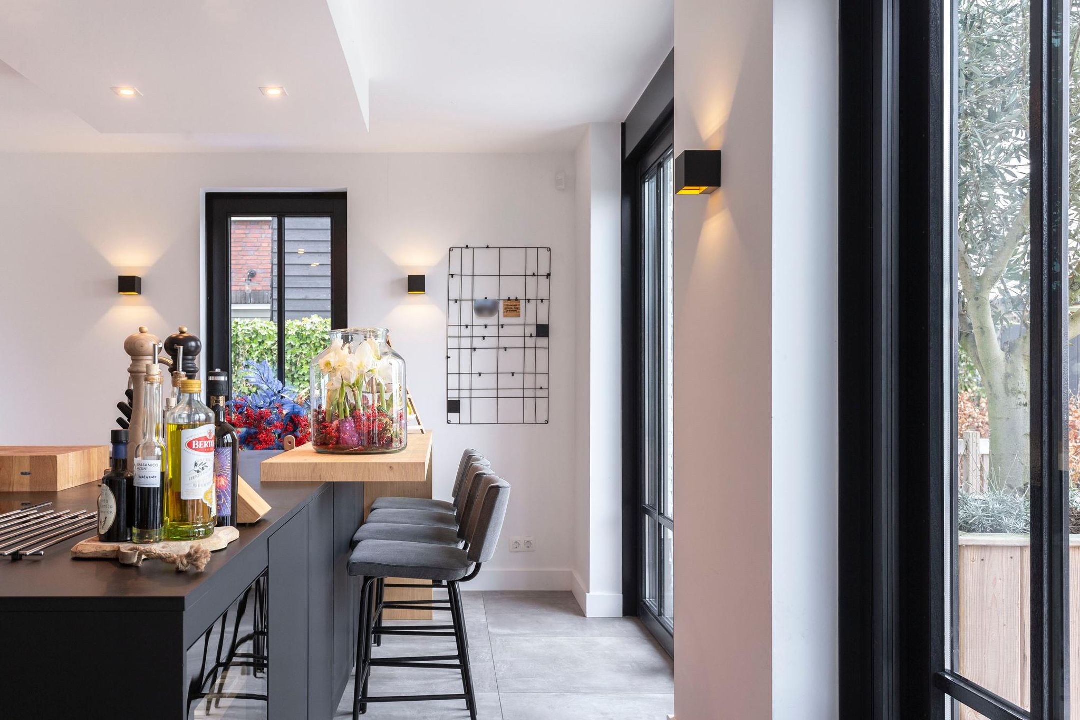 Via de woonkamer komt u in de woon-eetkeuken. Hier bevinden zich twee openslaande deuren naar de achtertuin. De moderne keuken (Exclusieve Barletti design keuken) met kookeiland voorziet u van veel kastruimte en de benodigde inbouwapparatuur zoals een oven, combi oven-magnetron, vaatwasser, koelkast, vriezer, spoelgelegenheid met cooker en een wijnklimaatkast. Het kookgedeelte is een inductie kookplaat met ingebouwde afzuiging in het plafond.