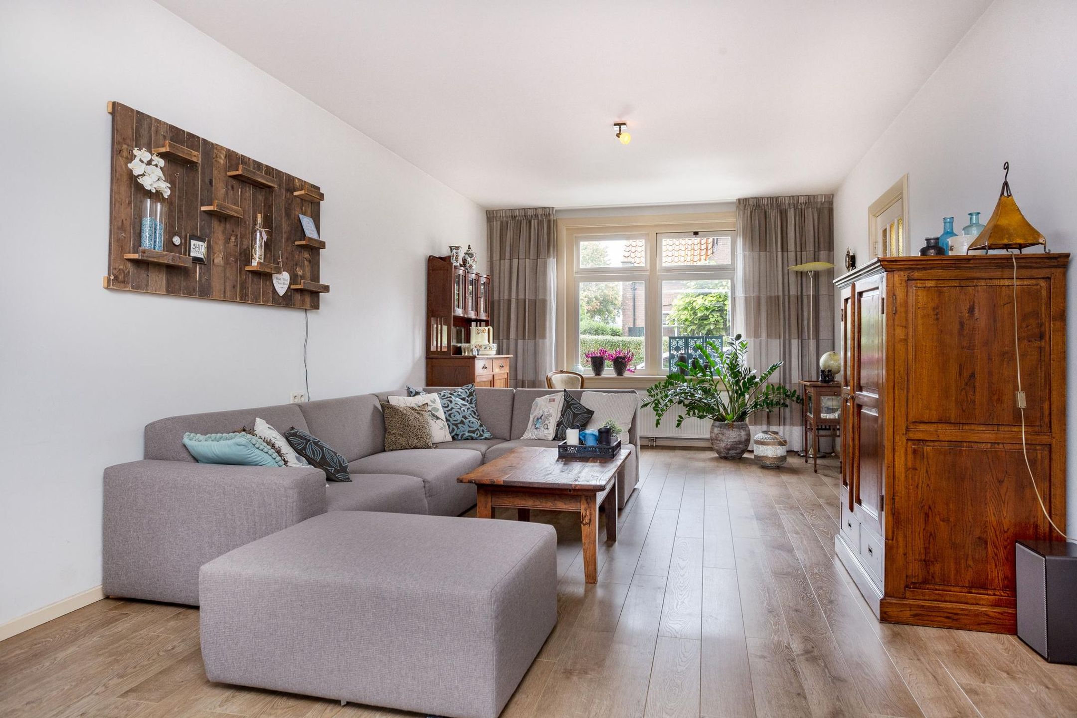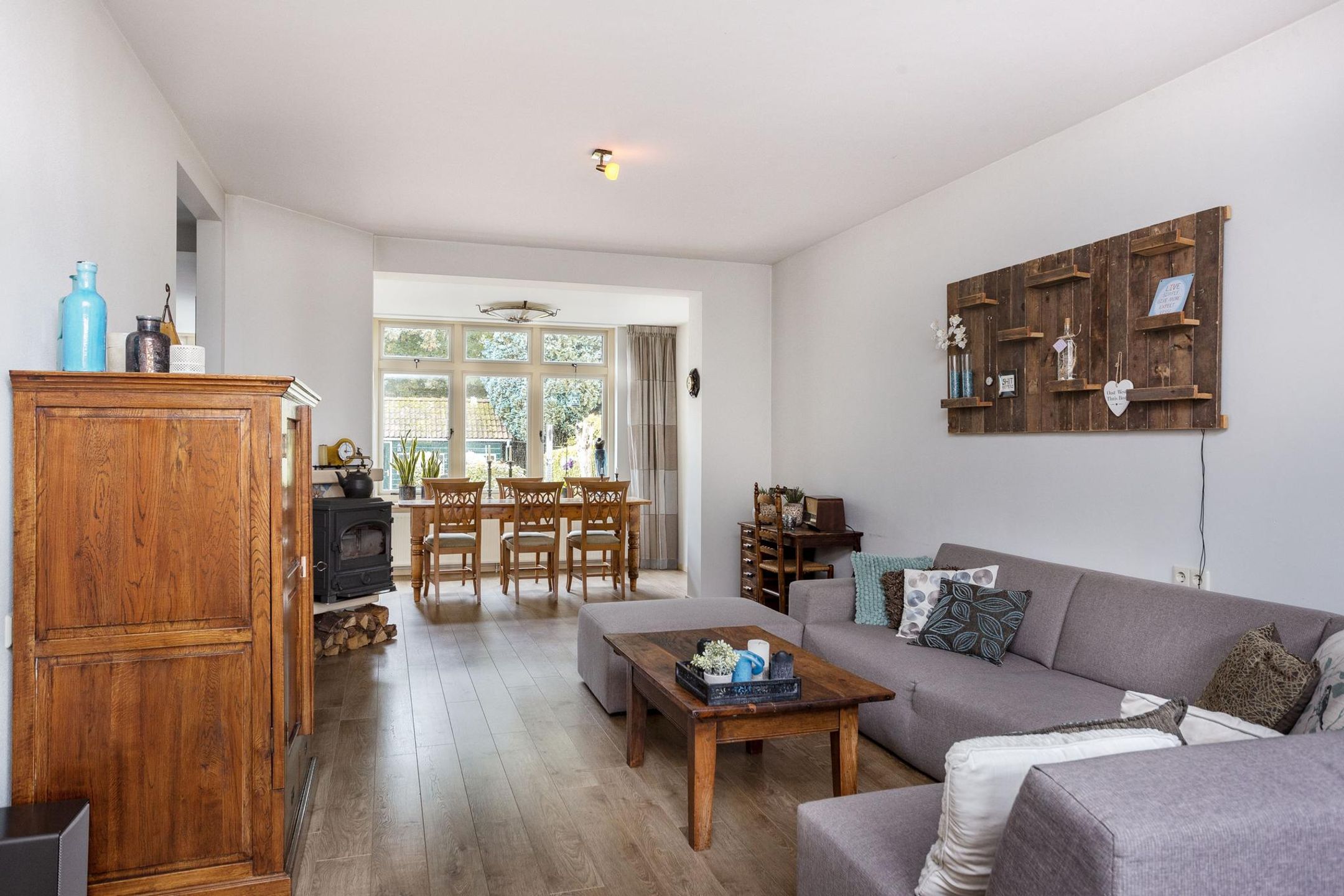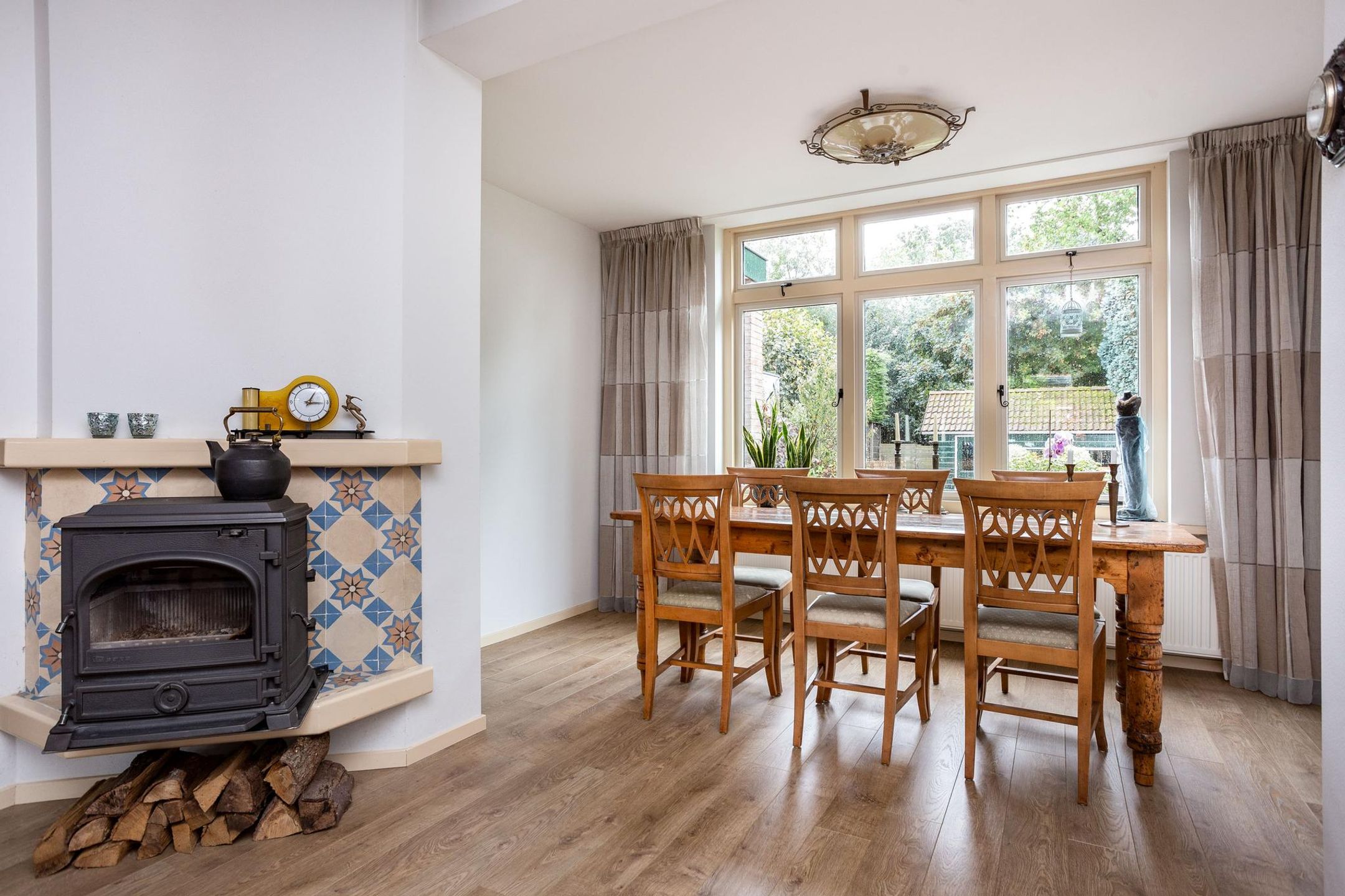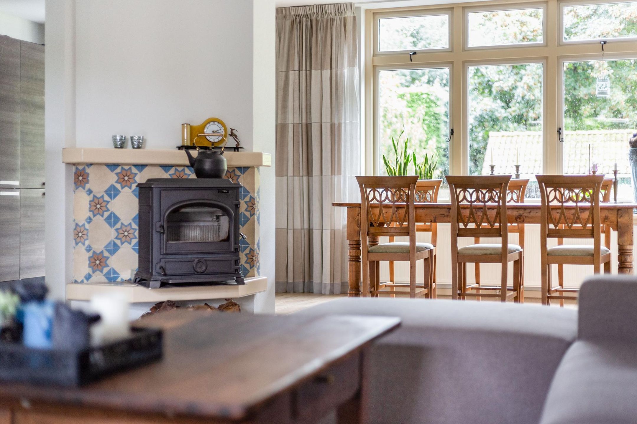 Ruime living aan de voorzijde van de woning welke voorzien is van een houtkachel. Via de woonkamer komt u in de lichte eetkamer welke uitkijkt op de zonnige achtertuin.