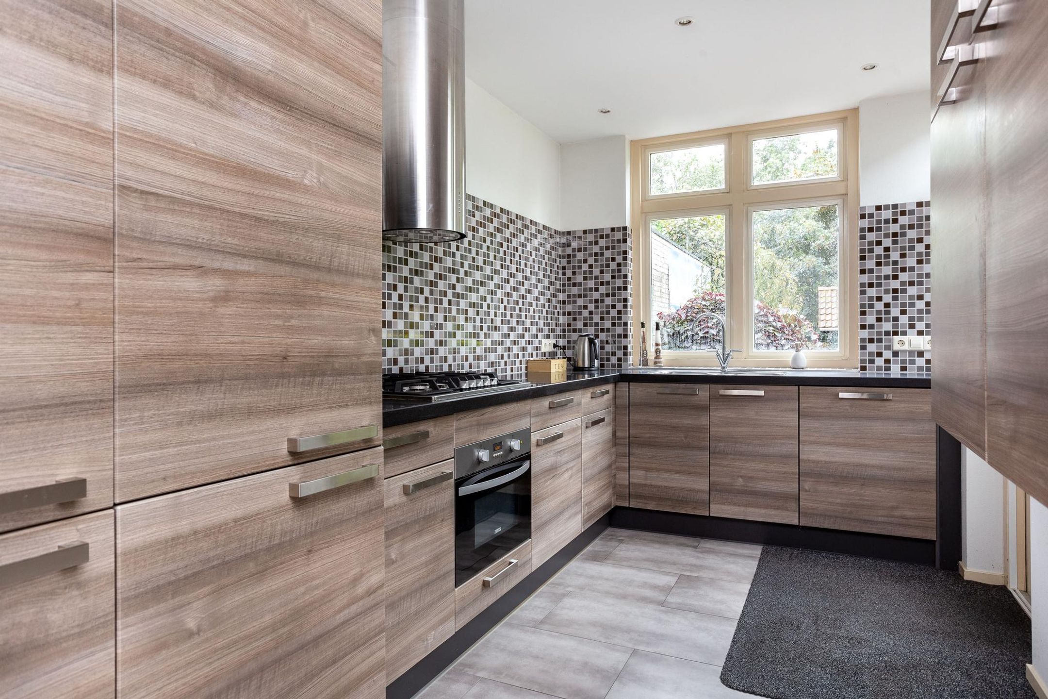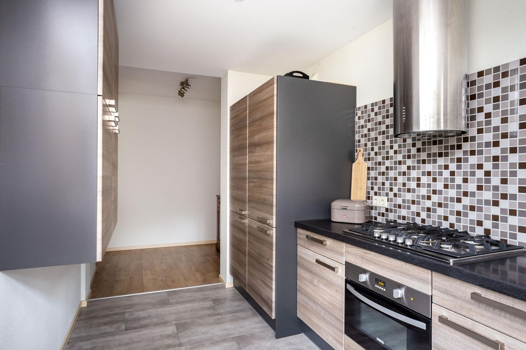 De half-open keuken ligt aan de achterzijde van de woning en is voorzien van diverse inbouwapparatuur zoals koelkast, vriezer, vaatwasmachine, oven, 5-pits gastoestel, afzuigkap, spoelgelegenheid en voldoende bergruimte. Tevens zijn hier de was- en droogmachine aansluitingen aanwezig en geeft de keuken via een loopdeur toegang naar de diepe achtertuin.